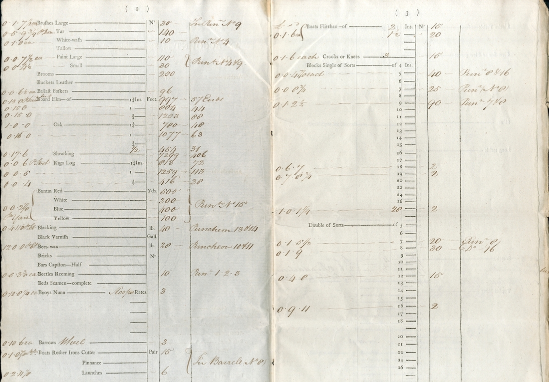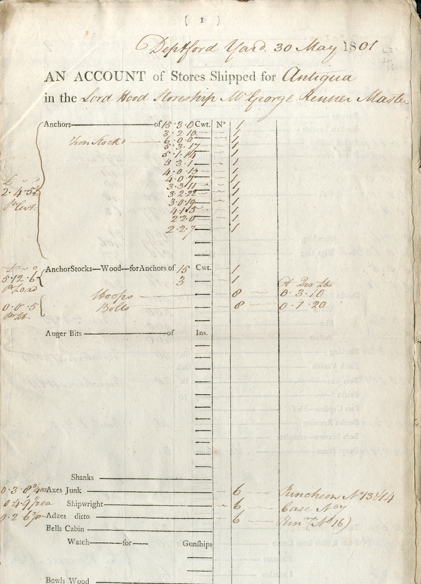 Account of stores shipped for Antigua in the ‘Lord Hood Storeship’, detailing quantities of such goods as anchors, sails, tar, cables, hammocks, screws, books and beeswax, compiled at Deptford Yard and dated 30 May 1801, condition commensurate with age, light stains and edge wear but a clear and legible bound account;