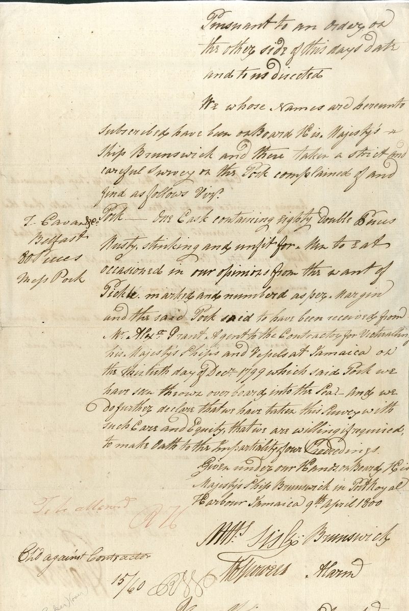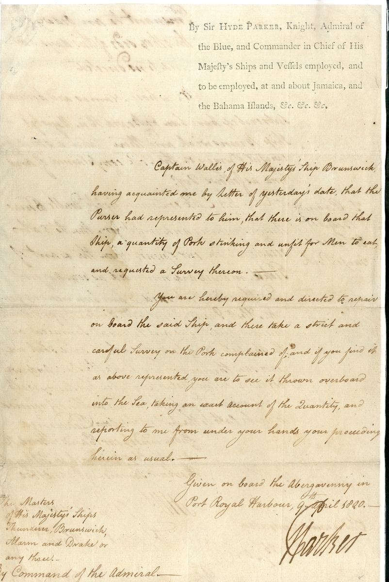 Letter to Captain Wallis requesting review of “a quantity of Pork stinking and unfit for Men to eat” on board H.M.S. Brunswick, signed by Admiral Sir Hyde Parker on board H.M.S. Abergavenny in Port Royal Harbour, dated 9 April 1800, and reverse detailing result of ordered survey, margins reinforced with border, and light stains, but does not interfere with text;