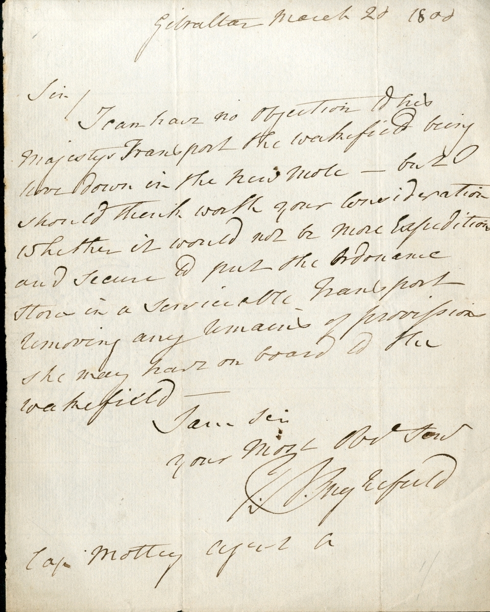 Letter confirming plans for H.M. Transport Wakefield and ordnance stores, signed by Captain John Nicholson Inglefield and dated 2 March 1800, light folds and stains consistent with age;