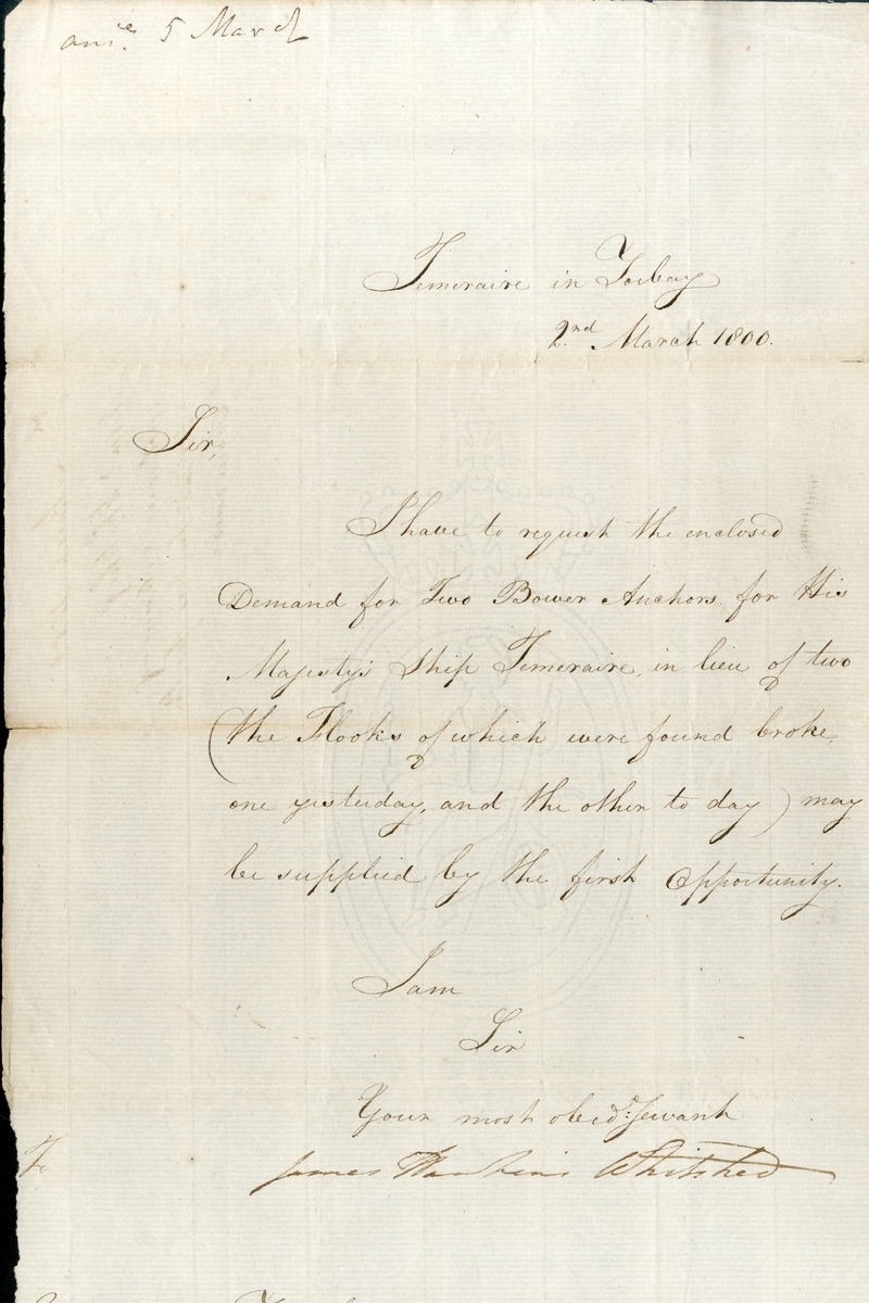 An order request to Commissioner Robert Fanshaw for two Bower Anchors for H.M.S. Temeraire, signed by Admiral James Hawkins Whitshed on board Temeraire in Torbay, dated 2 March 1800, light ageing and minor paper loss to margin and corner, text clear and legible;