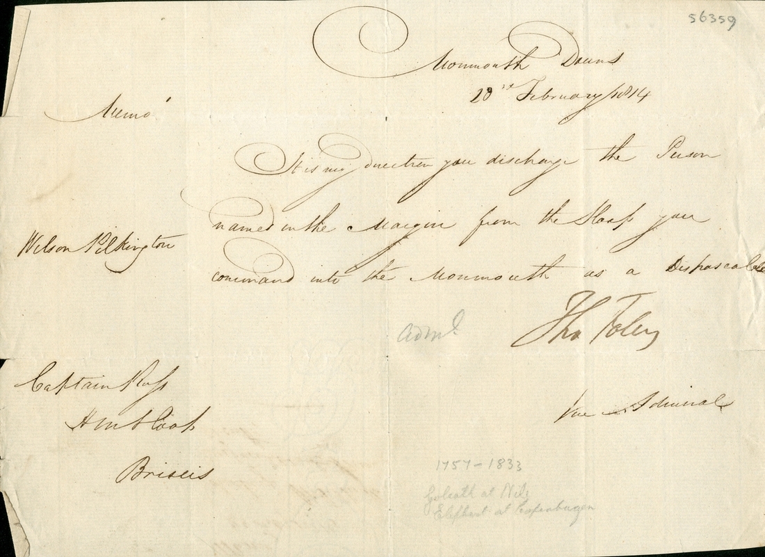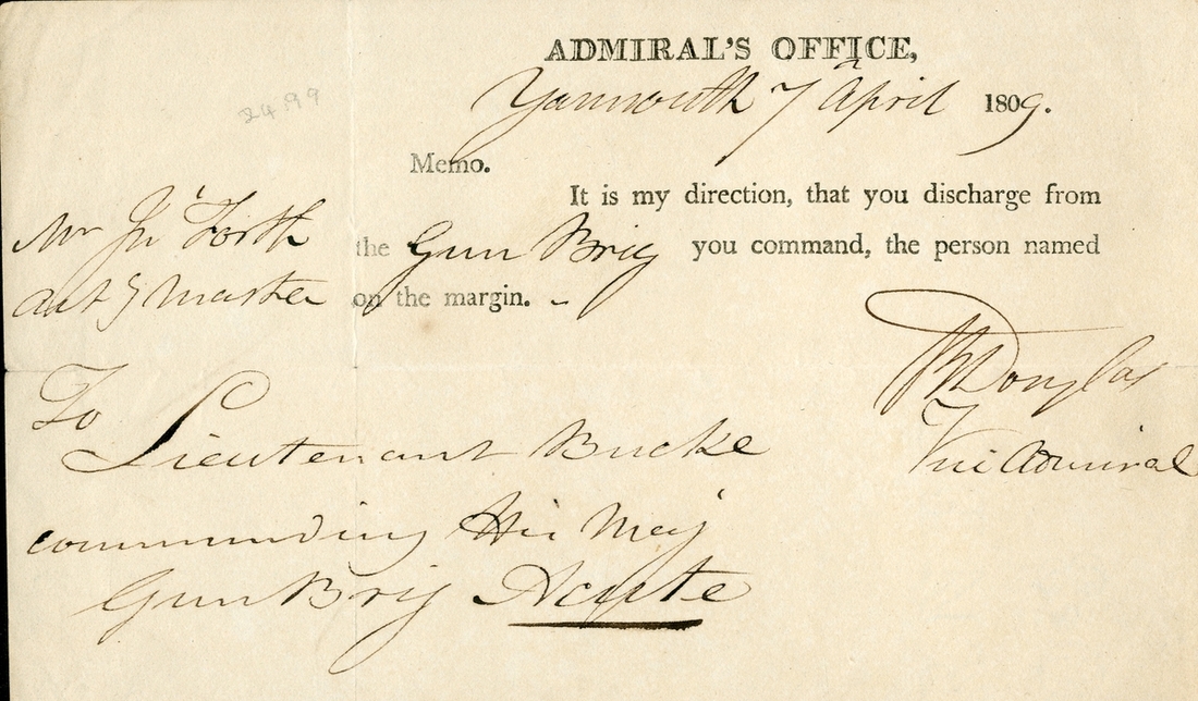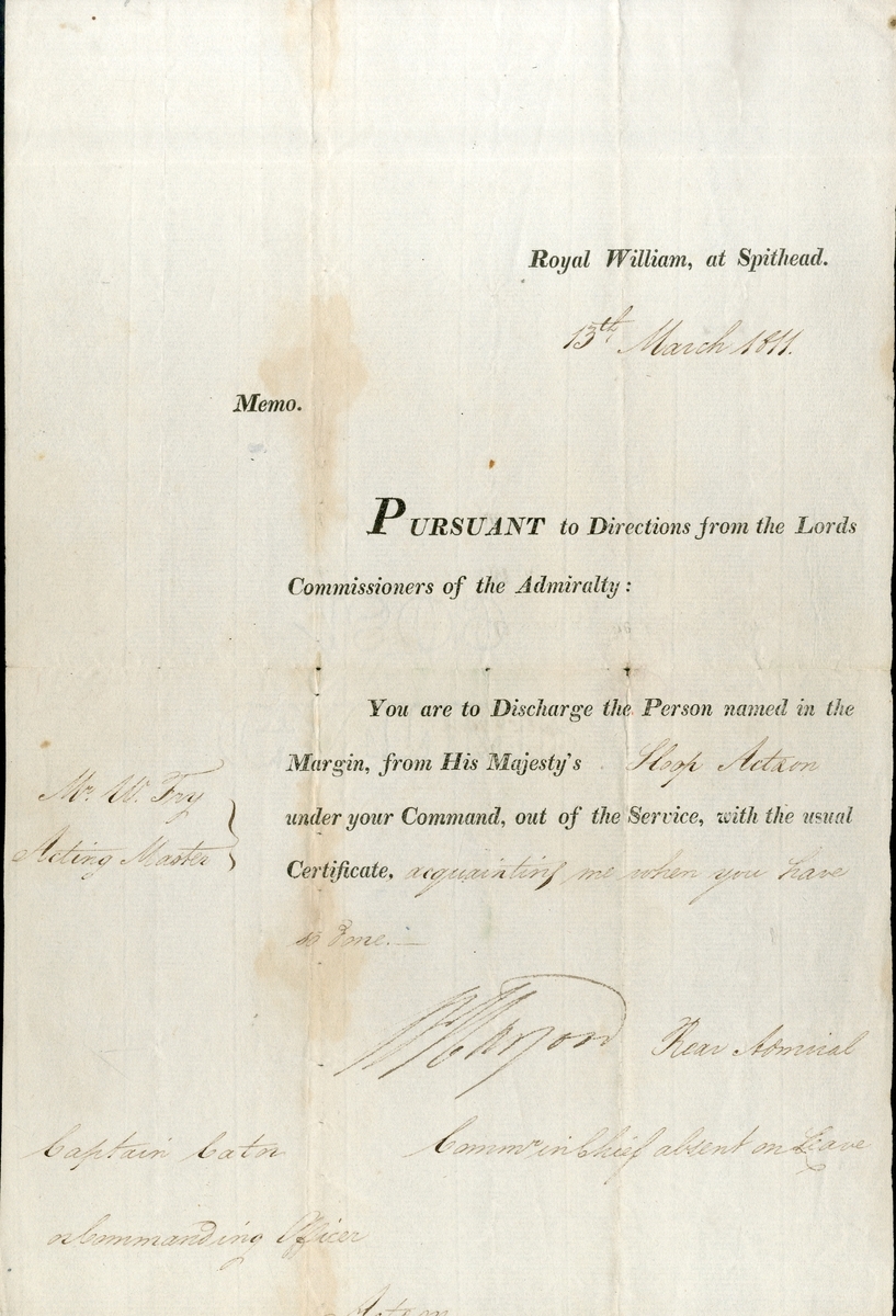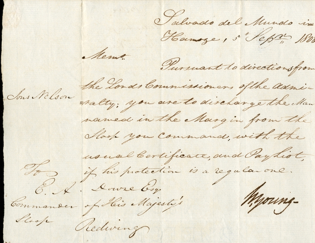 To include a Naval discharge for transfer of master’s mate to H.M.S. Valiant, signed by Admiral Colpoys of H.M.S. Hannibal, dated 20 October 1790; Order for Lieutenant on H.M.S. Redwing to leave without being superseded, signed by Admiral Young aboard H.M.S. Salvador del Mundo, dated 24 August 1808; Order to discharge John Nelson from Redwing, signed by Admiral Young on Salvador del Mundo, dated 5 September 1808; Order to discharge sailor on Redwing who was intended to have been discharged the previous year, signed by Admiral Young on Salvador del Mundo, dated 10 September 1808; Discharge order addressed to H.M.S. Acute, signed by Vice-Admiral Douglas, dated 7 April 1809; Discharge order addressed to H.M.S. Actaeon, signed by Rear-Admiral Hargood, dated 13 March 1811; Discharge order signed by Admiral Toley, dated 20 February 1814, ageing, folds, a few with edge wear, one with margin tears, otherwise text clear and legible throughout (7)