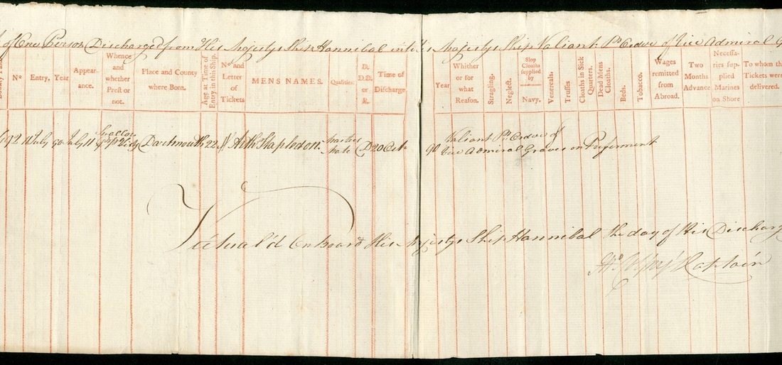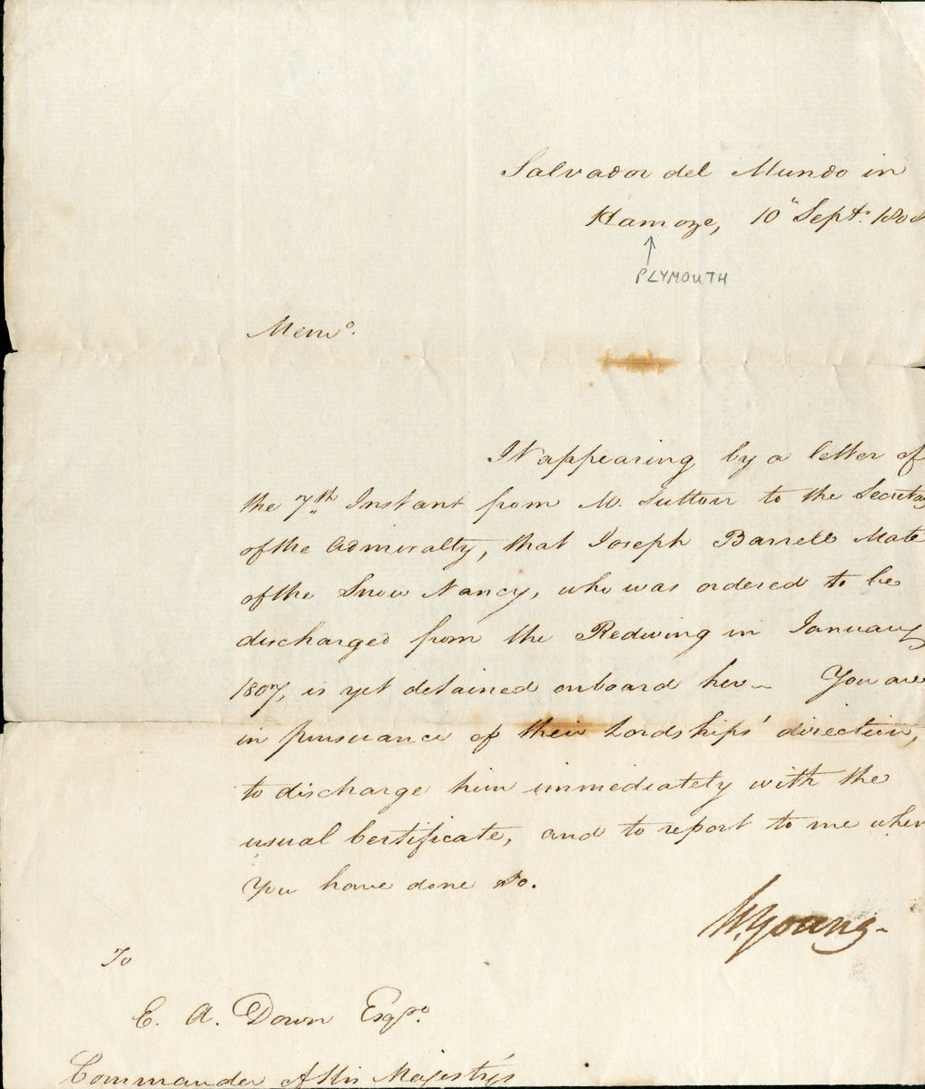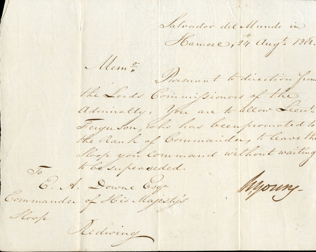 To include a Naval discharge for transfer of master’s mate to H.M.S. Valiant, signed by Admiral Colpoys of H.M.S. Hannibal, dated 20 October 1790; Order for Lieutenant on H.M.S. Redwing to leave without being superseded, signed by Admiral Young aboard H.M.S. Salvador del Mundo, dated 24 August 1808; Order to discharge John Nelson from Redwing, signed by Admiral Young on Salvador del Mundo, dated 5 September 1808; Order to discharge sailor on Redwing who was intended to have been discharged the previous year, signed by Admiral Young on Salvador del Mundo, dated 10 September 1808; Discharge order addressed to H.M.S. Acute, signed by Vice-Admiral Douglas, dated 7 April 1809; Discharge order addressed to H.M.S. Actaeon, signed by Rear-Admiral Hargood, dated 13 March 1811; Discharge order signed by Admiral Toley, dated 20 February 1814, ageing, folds, a few with edge wear, one with margin tears, otherwise text clear and legible throughout (7)