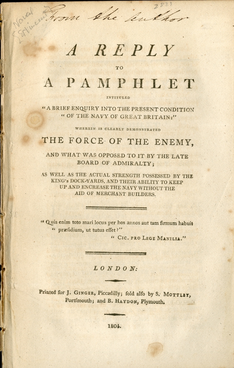 Pamphlet, ‘A Reply to A Pamphlet intituled “A Brief Enquiry into the Present Condition of the Navy of Great Britain”: wherein is clearly demonstrated The Force of the Enemy, and what was opposed to it by the Late Board of Admiralty; as well as the actual strength possessed by the King’s dock-yards, and their ability to keep up and encrease the Navy without the aid of merchant builders’, printed in London 1804, handwritten text at top reads ‘From the Author’, large folding table at end, age stains, text otherwise clear and legible;
