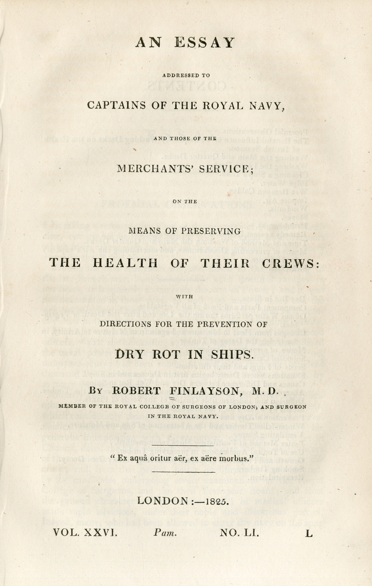 Pamphlet entitled ‘An Essay addressed to Captains of the Royal Navy and those of the Merchants’ Service; on the Means of Preserving The Health Of Their Crews: with directions for the prevention of Dry Rot In Ships’, written by Royal Navy surgeon Robert Finlayson M.D., printed in London 1825, removed from larger bound book, in very good condition for its age (7)