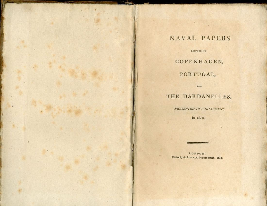 A bound hardcover book ‘Naval Papers Respecting Copenhagen, Portugal, and the Dardanelles, Presented to Parliament in 1808’, printed in London 1809, foxing and age stains, wear to page edges, damage to spine, but text legible and pages all apparently present;
