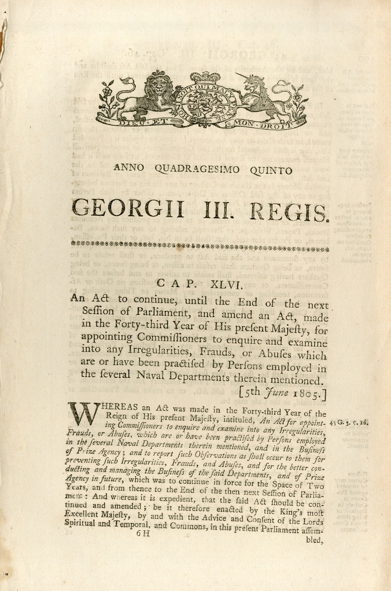 Parliamentary Act ‘for appointing Commissioners to enquire and examine into any Irregularities, Frauds or Abuses which are or have been practiced by Persons employed in the several Naval Departments therein mentioned’, dated 5 June 1805, pages removed from larger books, small holes, especially along binding, text clear and legible;