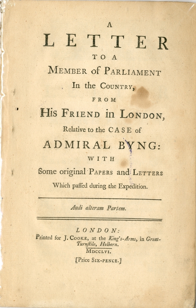 The pamphlet “A Letter to a Member of Parliament In the Country, From His Friend in London, Relative to the Case of Admiral Byng: with Some original Papers and Letters Which passed during the Expedition.”, printed in London, 1756; and the pamphlet “A Letter to A Gentleman in the Country, From His Friend in London: Giving an Authentik and circumstantial Account of the Confinement, Behaviour, and Death of Admiral Byng, As attested by the Gentlemen who were present.”, printed in London, 1757, the first lacking binding and with some age spots, both pamphlets are otherwise in good condition with the pages clear and legible (2)