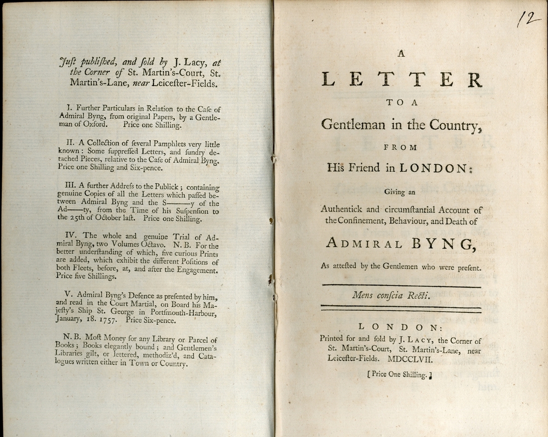 (x) Two contemporary pamphlets relating to Admiral John Byng, who was court martialled and sentenced to death by firing squad for “failing to do his utmost” in preventing the French from capturing Minorca