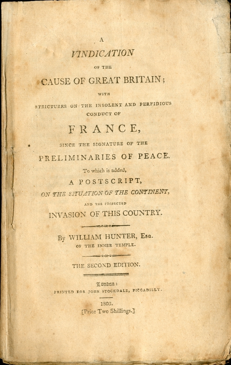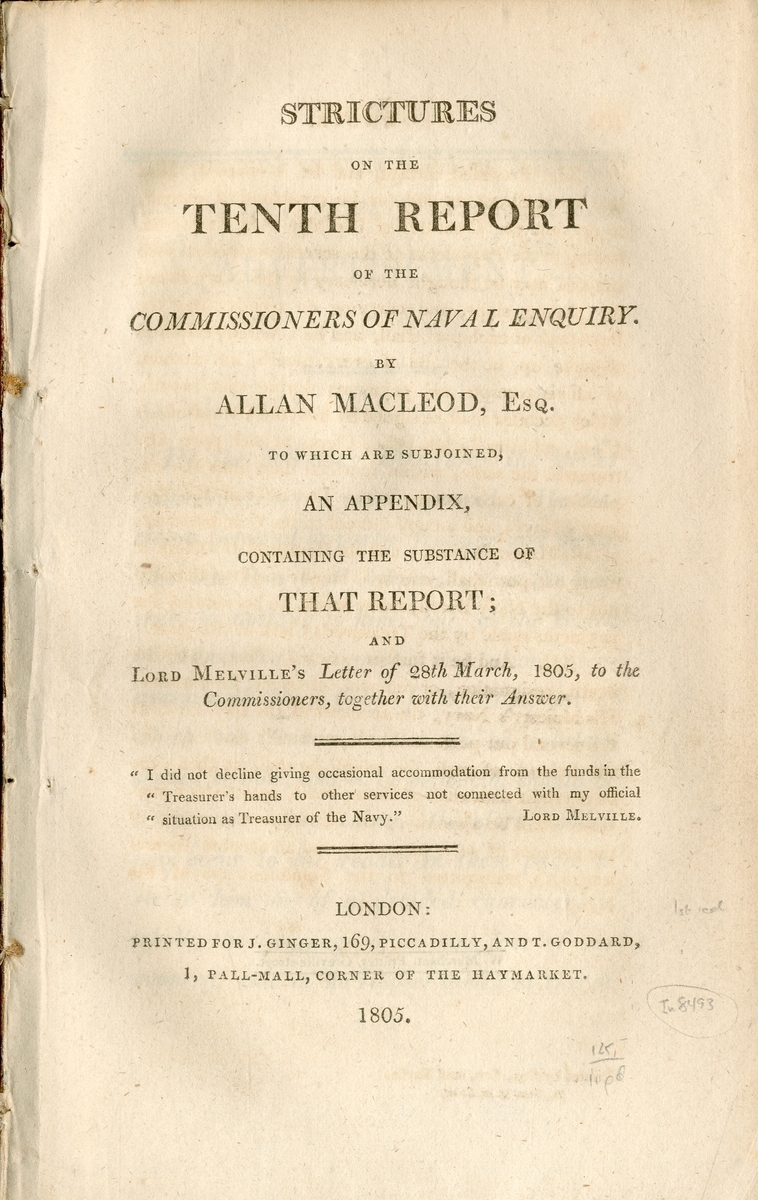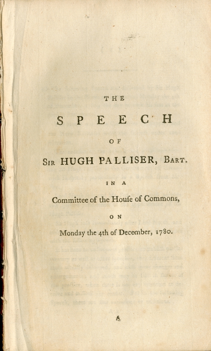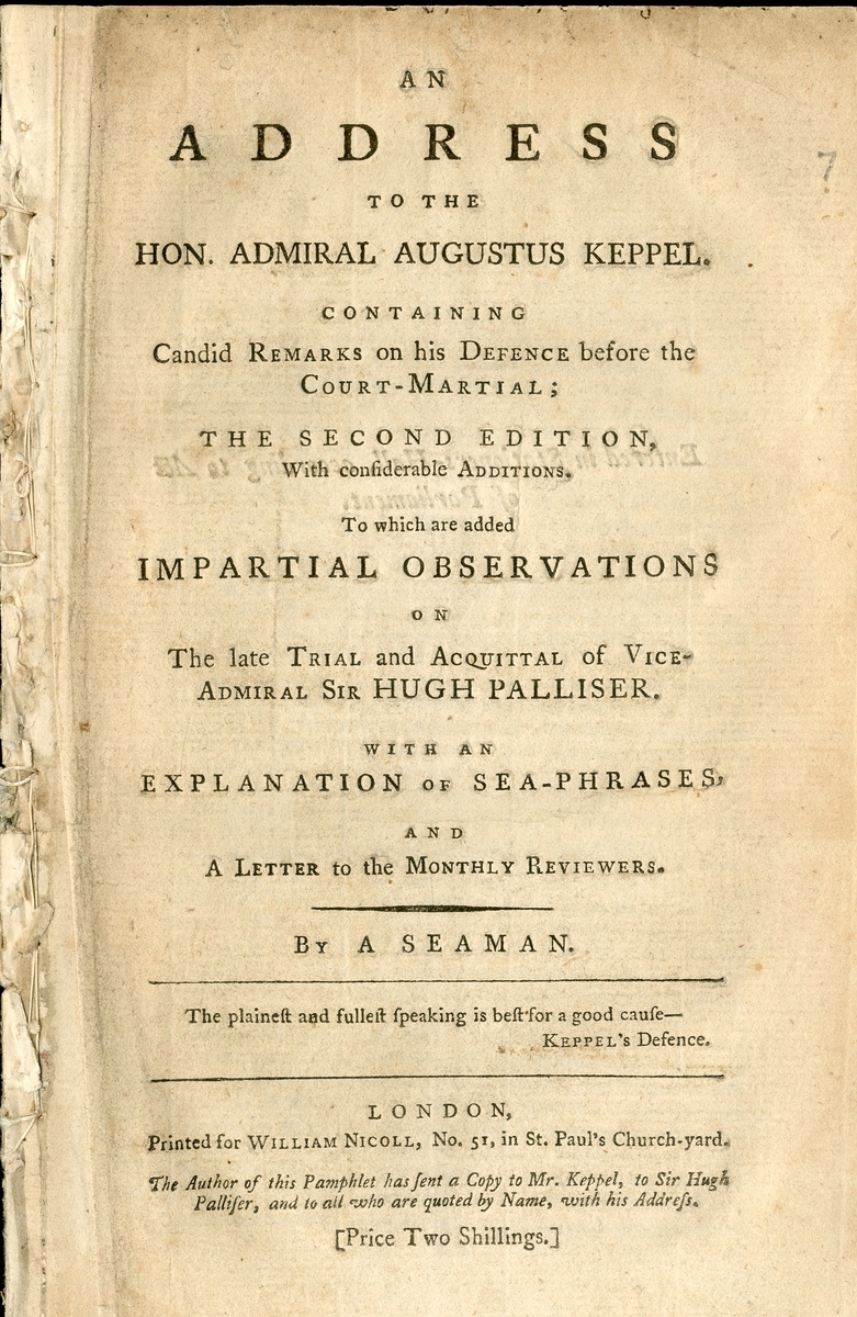 The pamphlet “An Address to the Hon. Admiral Augustus Keppel, containing candid Remarks on his Defence before the Court-Martial: The Second Addition, with considerable additions, to which are added Impartial Observations on the late Trial and Acquittal of Vice-Admiral Sir Hugh Palliser, with an explanation of sea-phrases, and a letter to the monthly reviewers. By a Seaman.”, printed in London, circa 1779; “The Speech of Sir Hugh Palliser, Bart. in a Committee of the House of Commons on Monday the 4th of December, 1780.”; The pamphlet “A Vindication of the Cause of Great Britain; with strictures on the insolent and perfidious conduct of France, since the signature of the Preliminaires of Peace. To which is added a postscript, on the situation of the continent, and the projected Invasion of This Country. By William Hunter, Esq.”, printed in London, 1803; The pamphlet “Strictures on the Tenth Report of the Commissioners of Naval Enquiry. By Allan MacLeod, Esq.”, printed in London, 1805, all are bound, some with a few pages coming loose, light ageing, one with edge wear and some contemporary pen marks and notes, otherwise overall text is clear and legible (4)