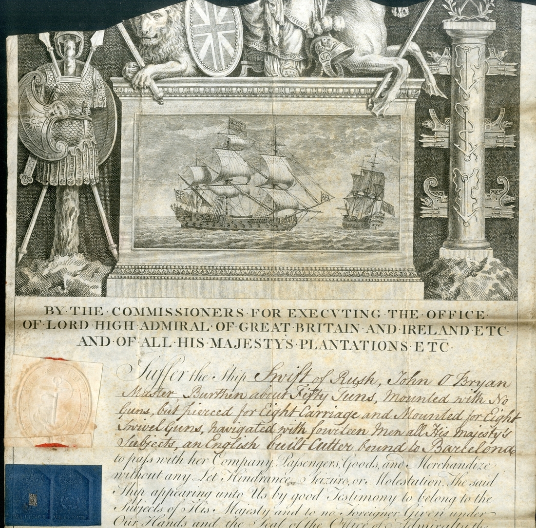 Admiralty Pass with order “to Suffer the Ship Swift of Rush, John O’Bryan Master, Burthen about Fifty Tuns, mounted with No Guns, but pierced for Eight Carriage and Mounted for Eight Swivel Guns, navigated with fourteen men all His Majesty’s Subjects, an English built Cutter bound to Barcelona to pass…without any Let Hindrance Seizure or Molestation.”, signed by the Earl of Sandwich, dated 30 March 1778, reverse features handwritten note “This Pass delivered to John O’Bryan at His Majesty’s Custom House in Dublin the Thirtieth day of March 1778”, printed on vellum and with Admiralty Seal, a couple minor pinholes to upper right, ageing and stains, text clear and legible (2)