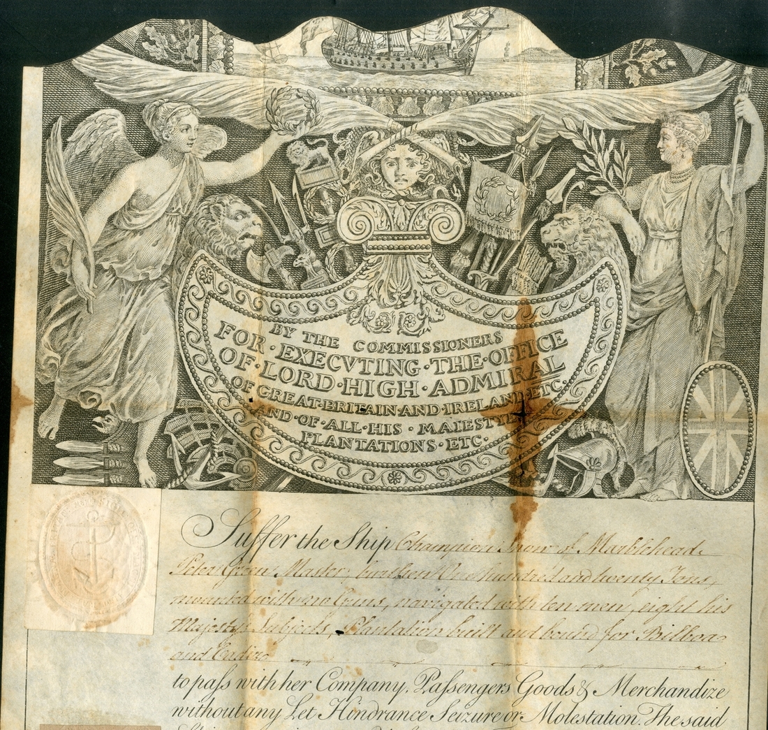 Admiralty Pass with order “to Suffer the Ship Champion Snow of Marblehead, Peter Green Master, Burthen One hundred and twenty Tons mounted with no Guns, navigated with ten men, all his Majesty's Subjects, Plantation built and bound for Bilbao and Cadiz to pass…without any Let Hindrance Seizure or Molestation.”, dated 1 August 1770, reverse features handwritten note "Delivered to the Master in Boston in the Province of Massachusetts Bay in New England the first day of August 1770”, printed on vellum and with Admiralty Seal, a few pinholes along folds and some stains and ageing, some rubbing to text makes it difficult to decipher in places but still largely legible