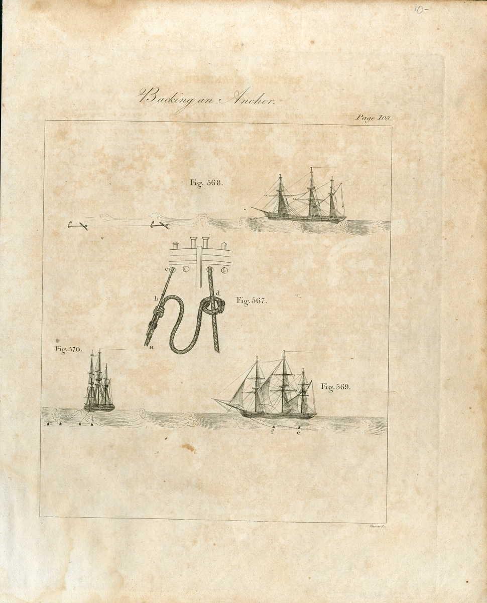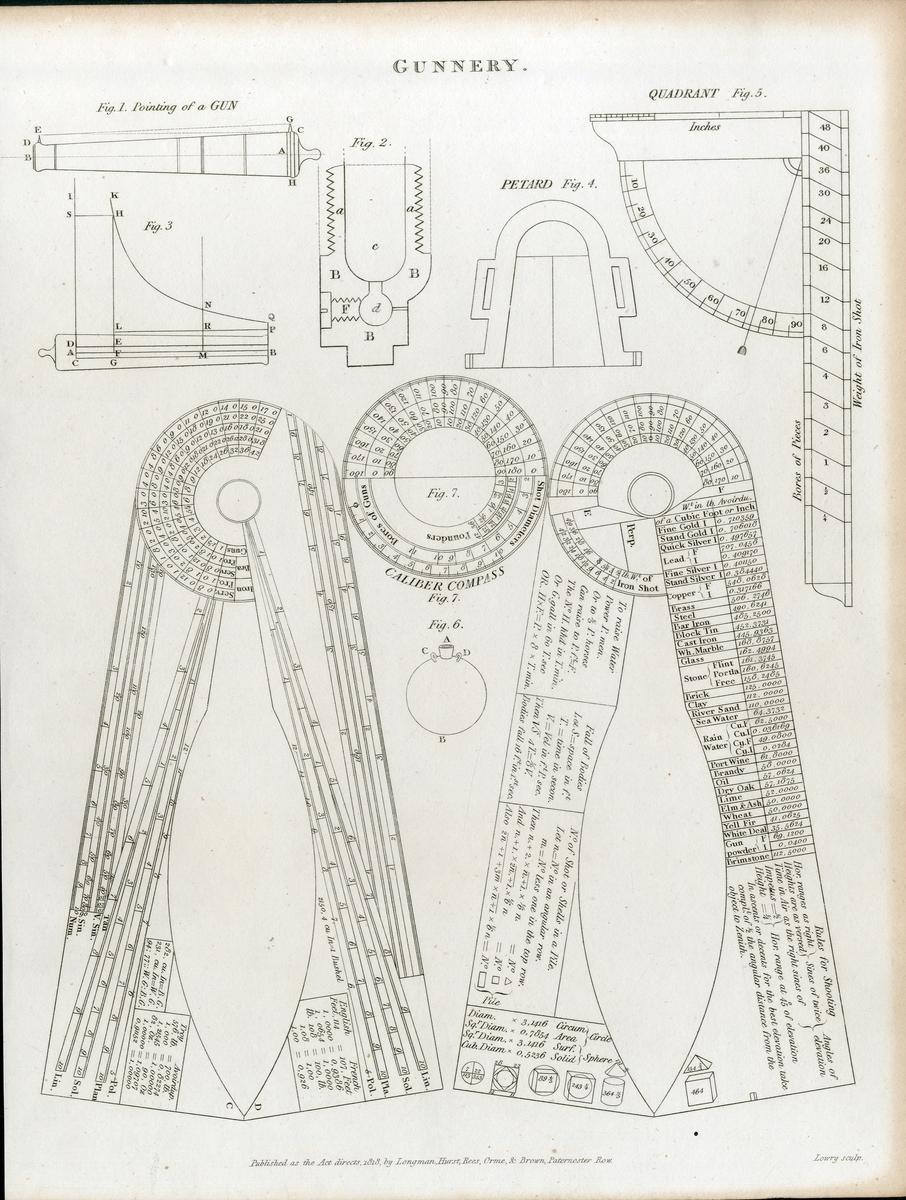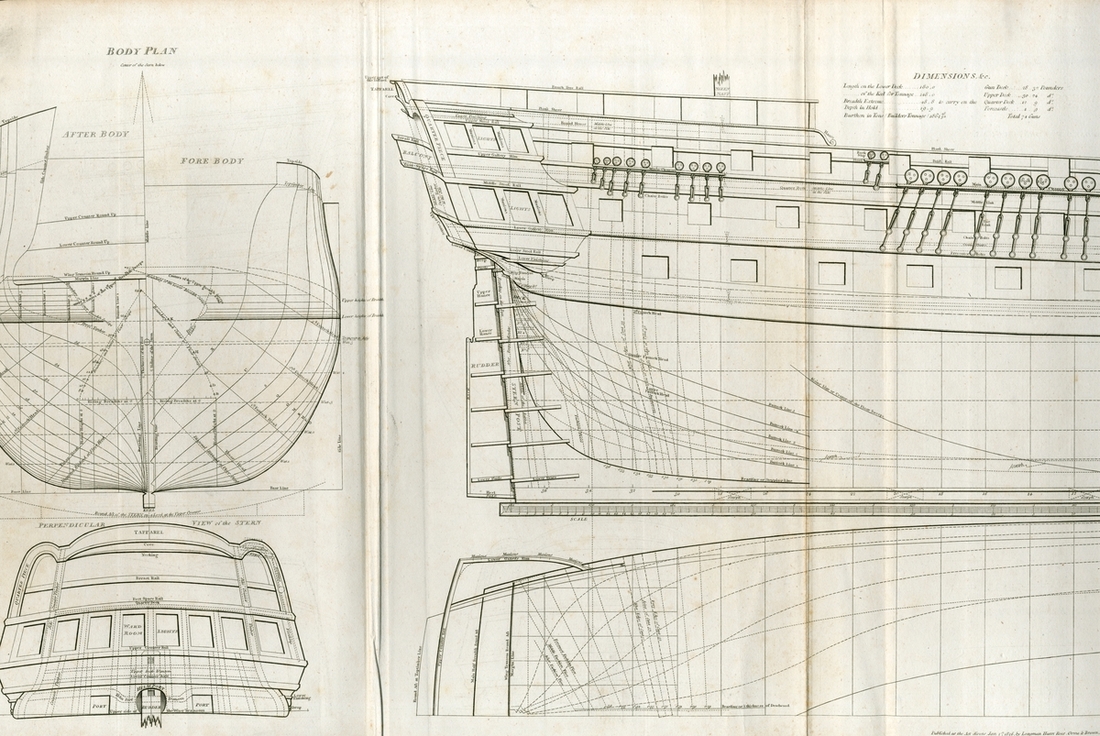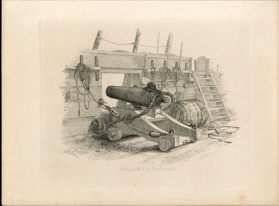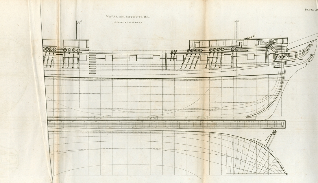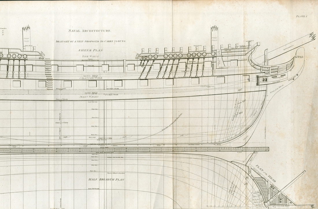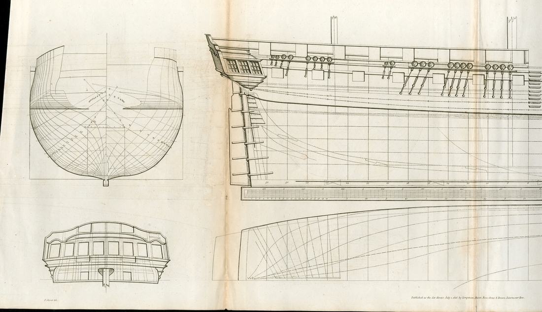 Two fold-out naval architecture plans, including ‘Plate I’ a draught of a ship proposed to carry 74 guns, and ‘Plate IX’ a naval architecture of a frigate of 38 guns, both published 1 July 1816 (2); a gunnery diagram detailing the pointing of a gun, a petard, a quadrant, and a few figures of a caliber compass, published 1818; figures detailing the backing of an anchor, taken from a larger book, circa 1819; print depicting a Brig of War’s 12 pounder carronade, some with foxing and evidence of age, the architecture plans with folds and creases, in good condition overall (5)