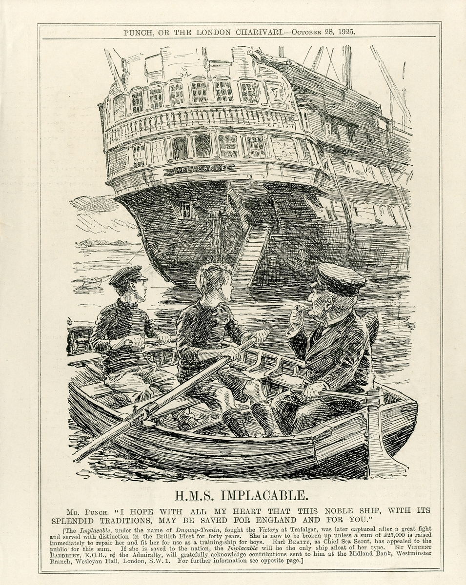 To include an autograph letter written by Admiral Richard Godwin Keats on board Implacable off the coast of Cadiz, dated 24 July 1810, written whilst en route to defend Cadiz; a photograph and accompanying glass plate negative of Implacable; a Punch cartoon of the ship to promote the fundraiser, dated 28 October 1925; a 20th century pamphlet ‘The Story of The Implacable’; together with a couple of modern copy photograph postcards (5)