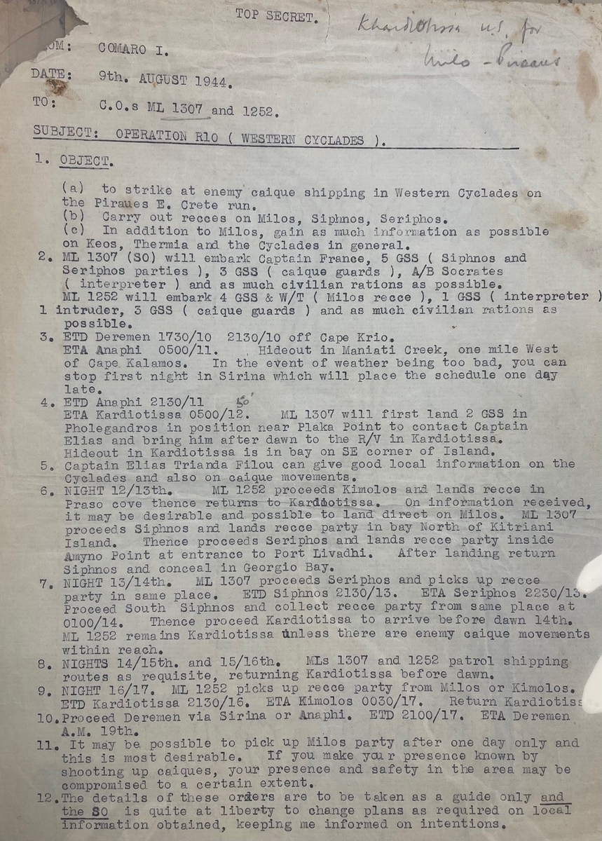 Top Secret Operational Orders for ML-1307 and ML-1252 to take part in Operation R10 in the Western Cyclades, dated 9 August 1944.