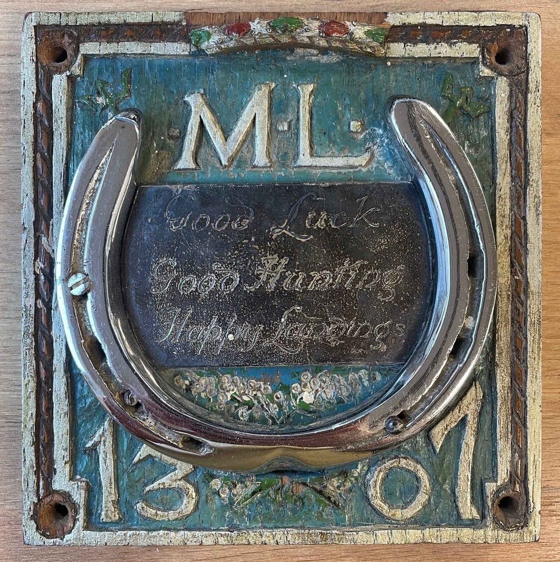 An unusual handmade carved plaque for ML-1307 adorned with a horse shoe and the engraved silver plaque: 'Good Luck Good Hunting Happy Landings'.