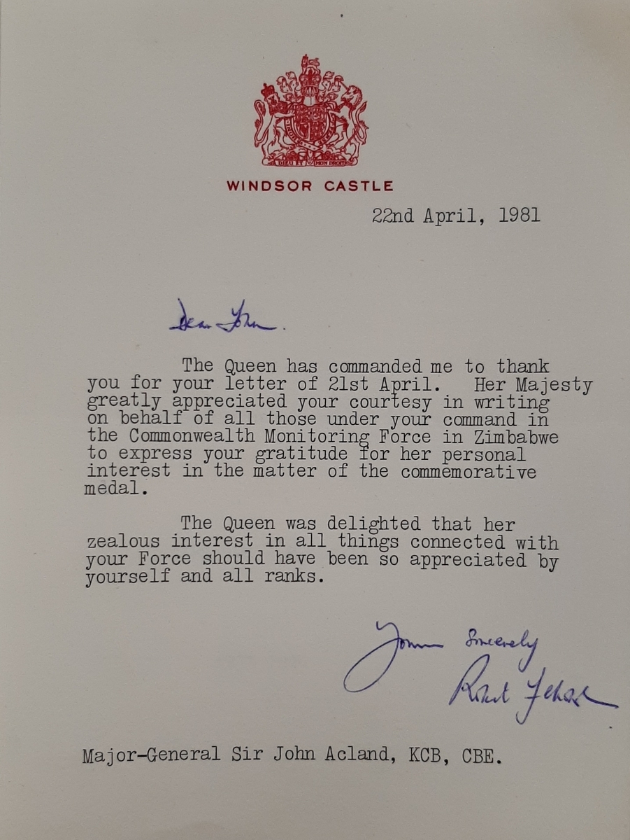 A letter from Windsor Castle written on behalf of Queen Elizabeth II, commending the recipient on his successful command in Rhodesia.