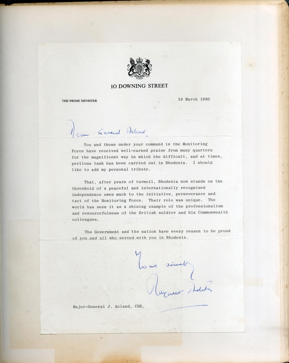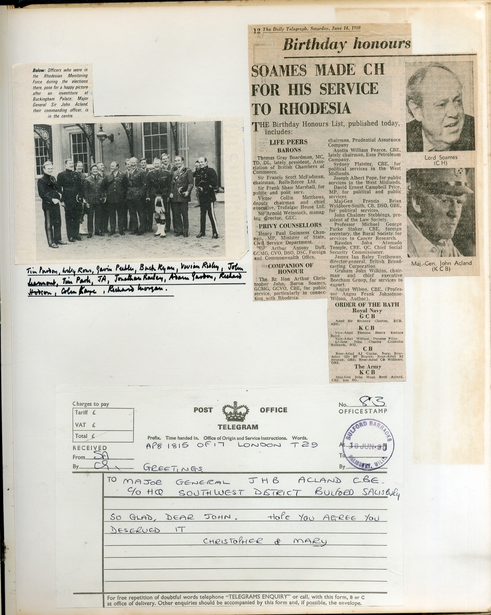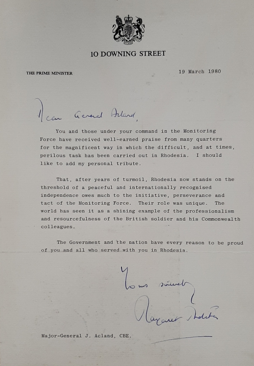 Returning to the command of the South West District, Acland lamented the continued problems of finance and staffing which had so plagued him before leaving for Rhodesia. Retiring on 7 May 1982 he died at Honiton, Devon on 17 November 2006; Sold together with copied research and an archive of original material comprising: