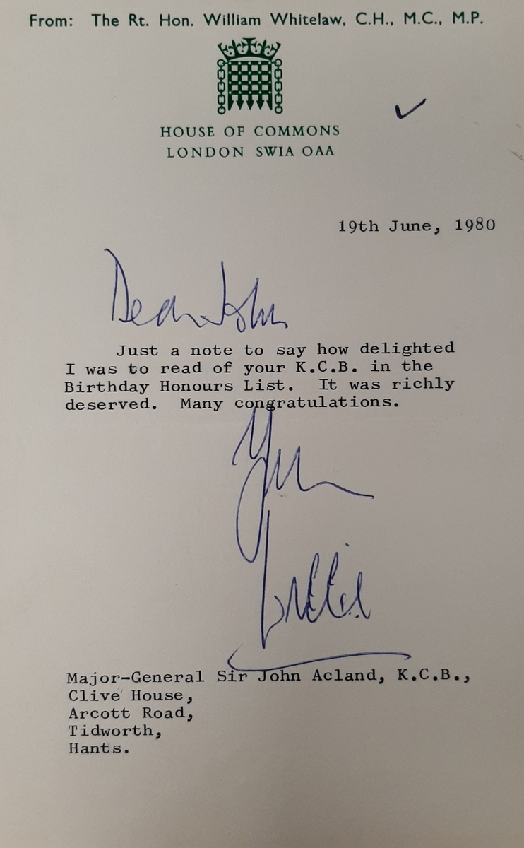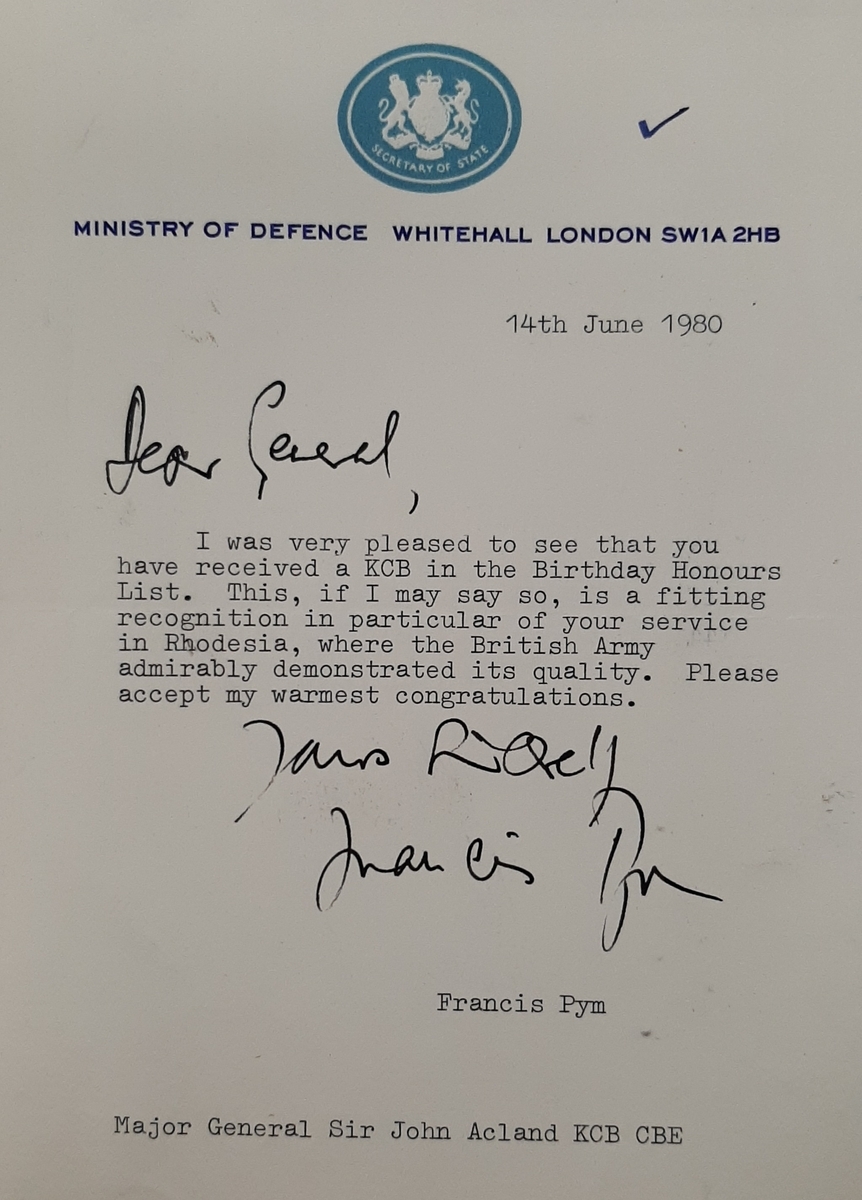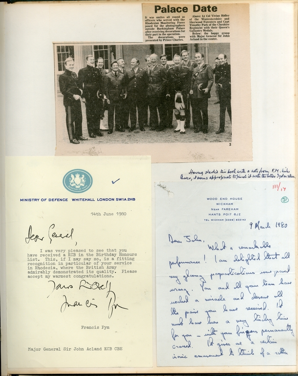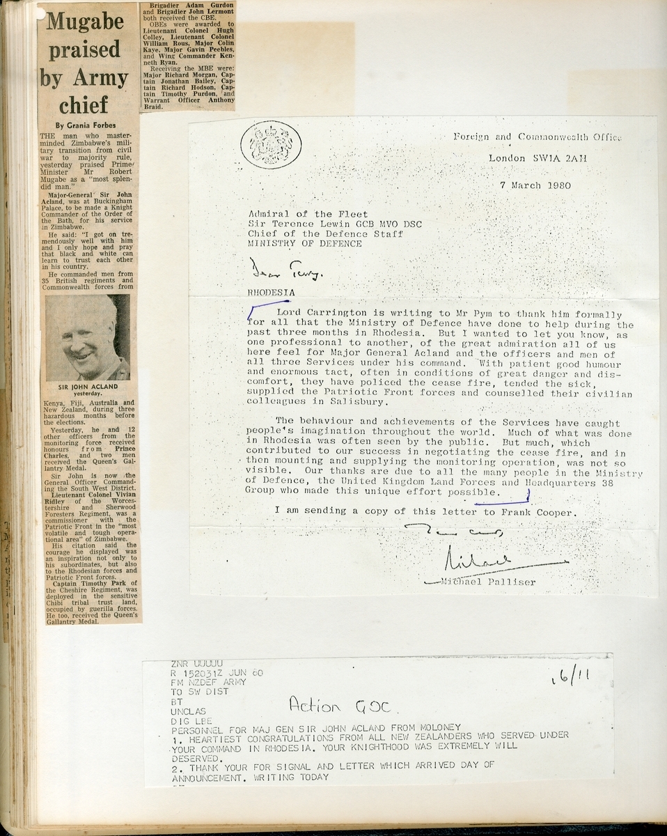 Returning to the command of the South West District, Acland lamented the continued problems of finance and staffing which had so plagued him before leaving for Rhodesia. Retiring on 7 May 1982 he died at Honiton, Devon on 17 November 2006; Sold together with copied research and an archive of original material comprising: