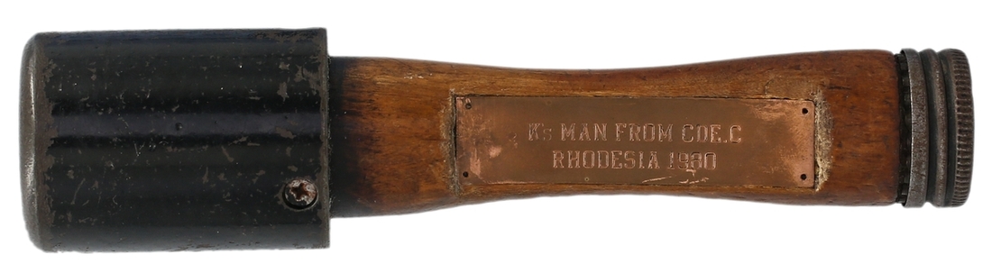 A practice grenade with a name plaque engraved 'K's Man from Cde. C Rhodesia 1980'