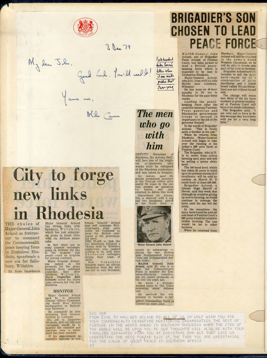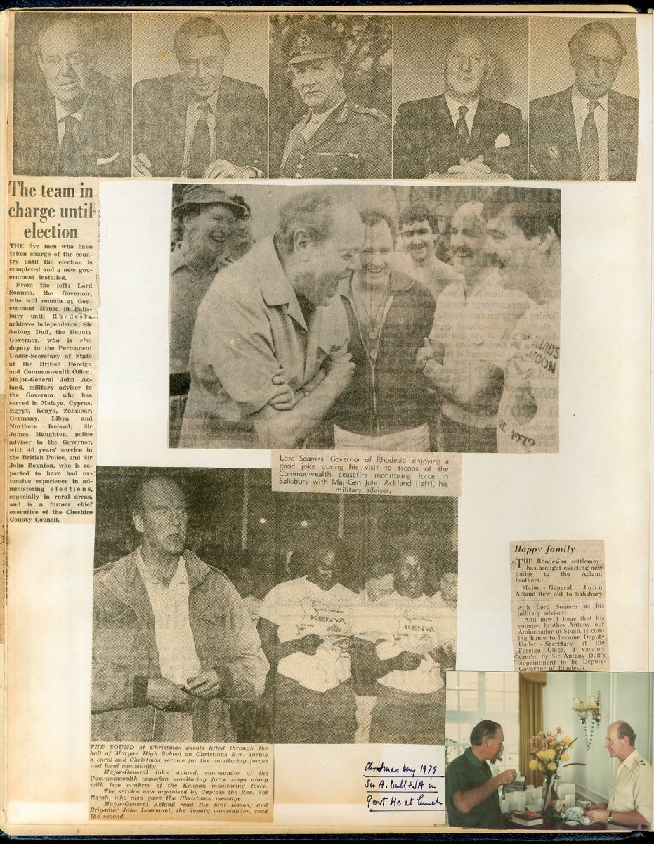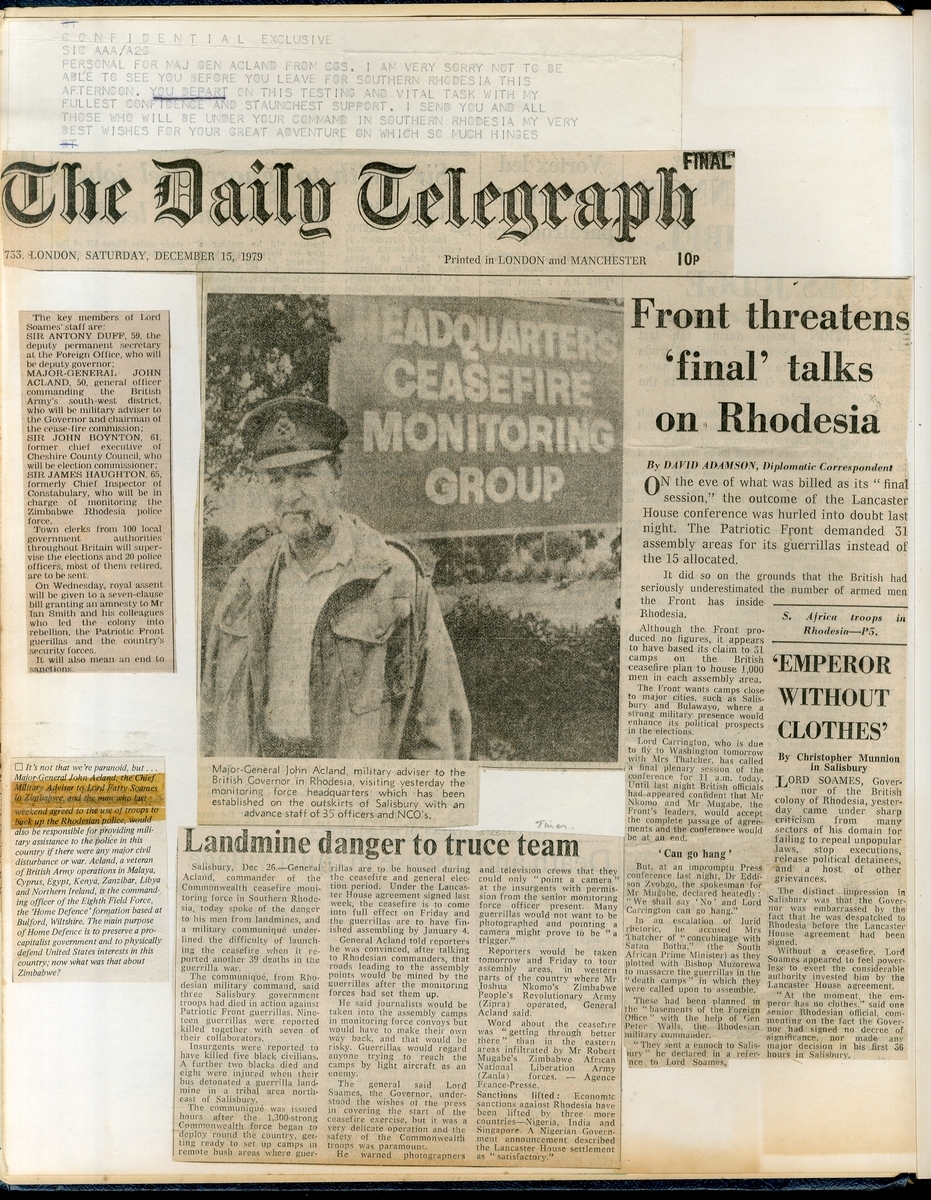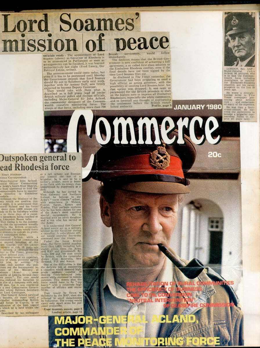 After prolonged negotiations, the black majority parties in Rhodesia reached agreement with the British Government and the white minority led by Ian Smith for Britain to resume responsibility for governing Rhodesia while elections were held. Warned that he might be ordered to Rhodesia on 'Guy Fawkes night' 1979 Acland was indeed selected to command the British Monitoring Force ordered to the country in the wake of the ceasefire, reporting to the newly appointed Governor, Christopher (later Lord) Soames. The huge challenge of overseeing a peaceful handover of power after a long and bitter civil war can hardly be overstated. It is perhaps best underlined by a short note written to Acland from Field Marshal Lord Carver when the news of his posting was made public, simply saying:
