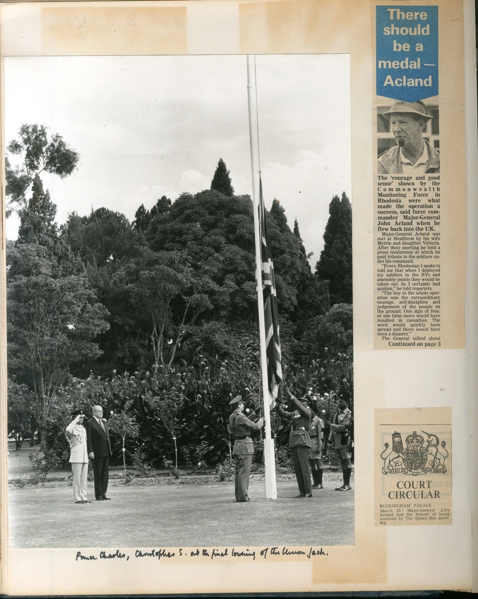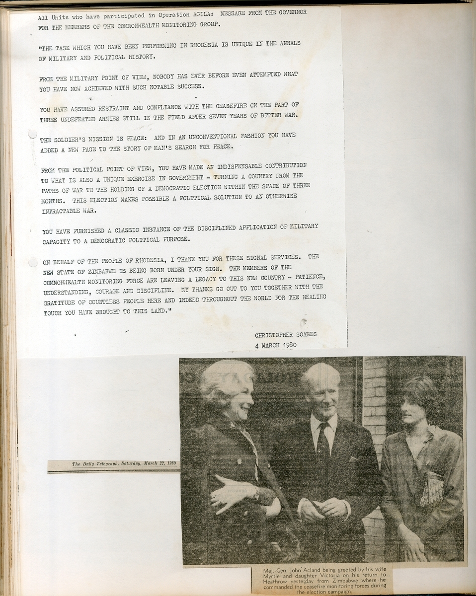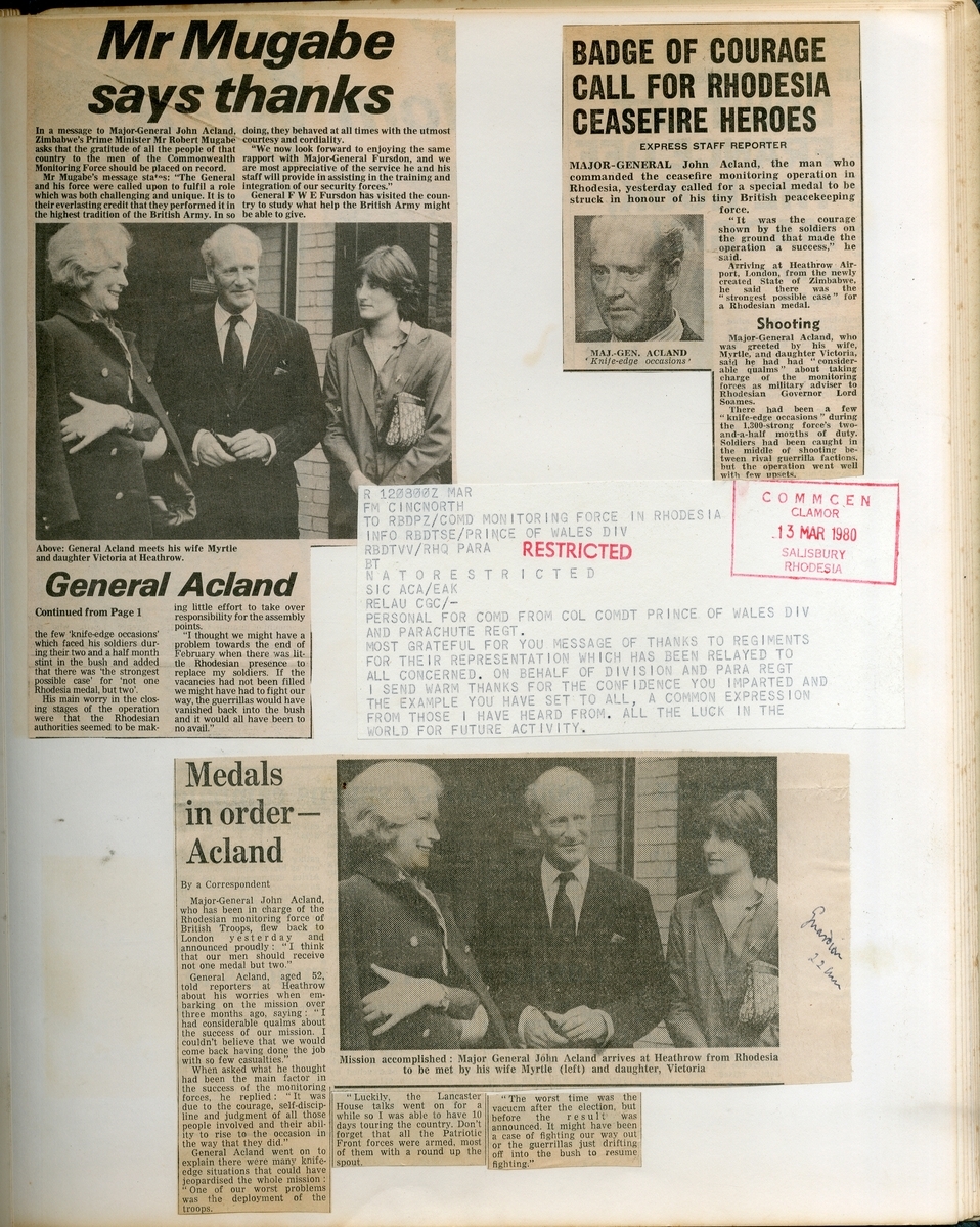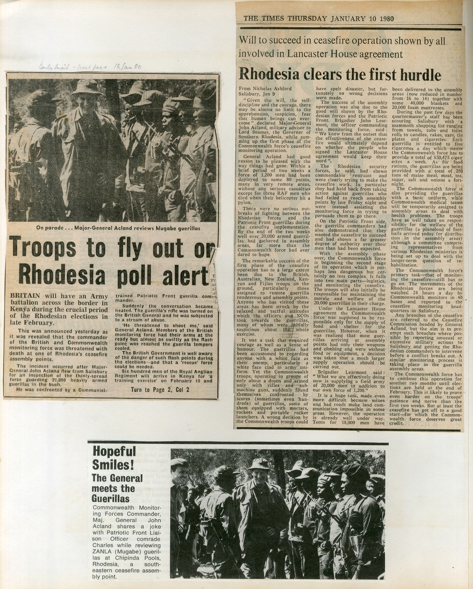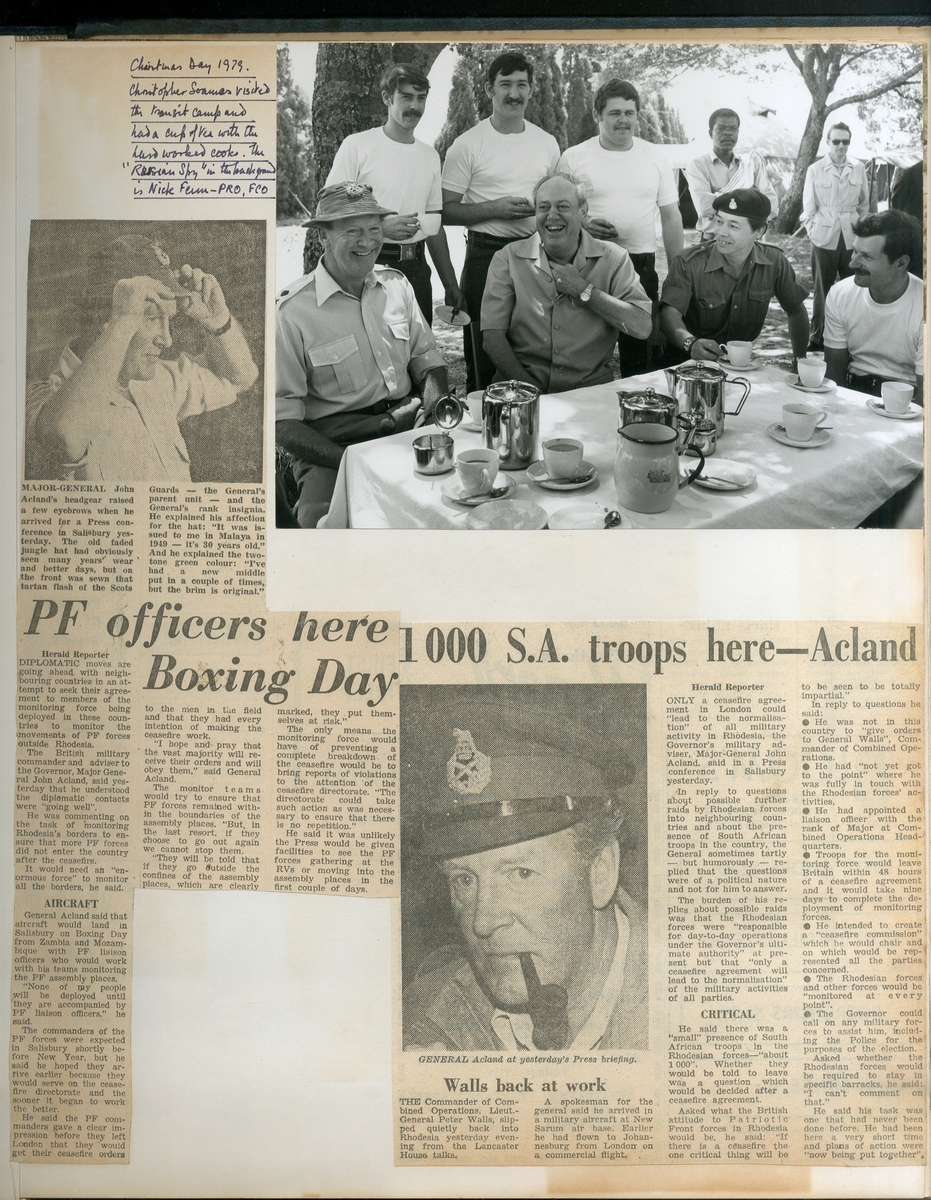 After prolonged negotiations, the black majority parties in Rhodesia reached agreement with the British Government and the white minority led by Ian Smith for Britain to resume responsibility for governing Rhodesia while elections were held. Warned that he might be ordered to Rhodesia on 'Guy Fawkes night' 1979 Acland was indeed selected to command the British Monitoring Force ordered to the country in the wake of the ceasefire, reporting to the newly appointed Governor, Christopher (later Lord) Soames. The huge challenge of overseeing a peaceful handover of power after a long and bitter civil war can hardly be overstated. It is perhaps best underlined by a short note written to Acland from Field Marshal Lord Carver when the news of his posting was made public, simply saying:
