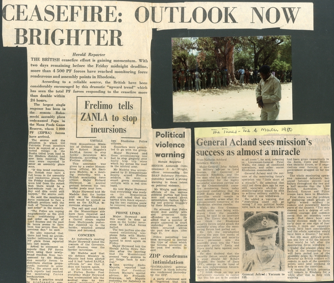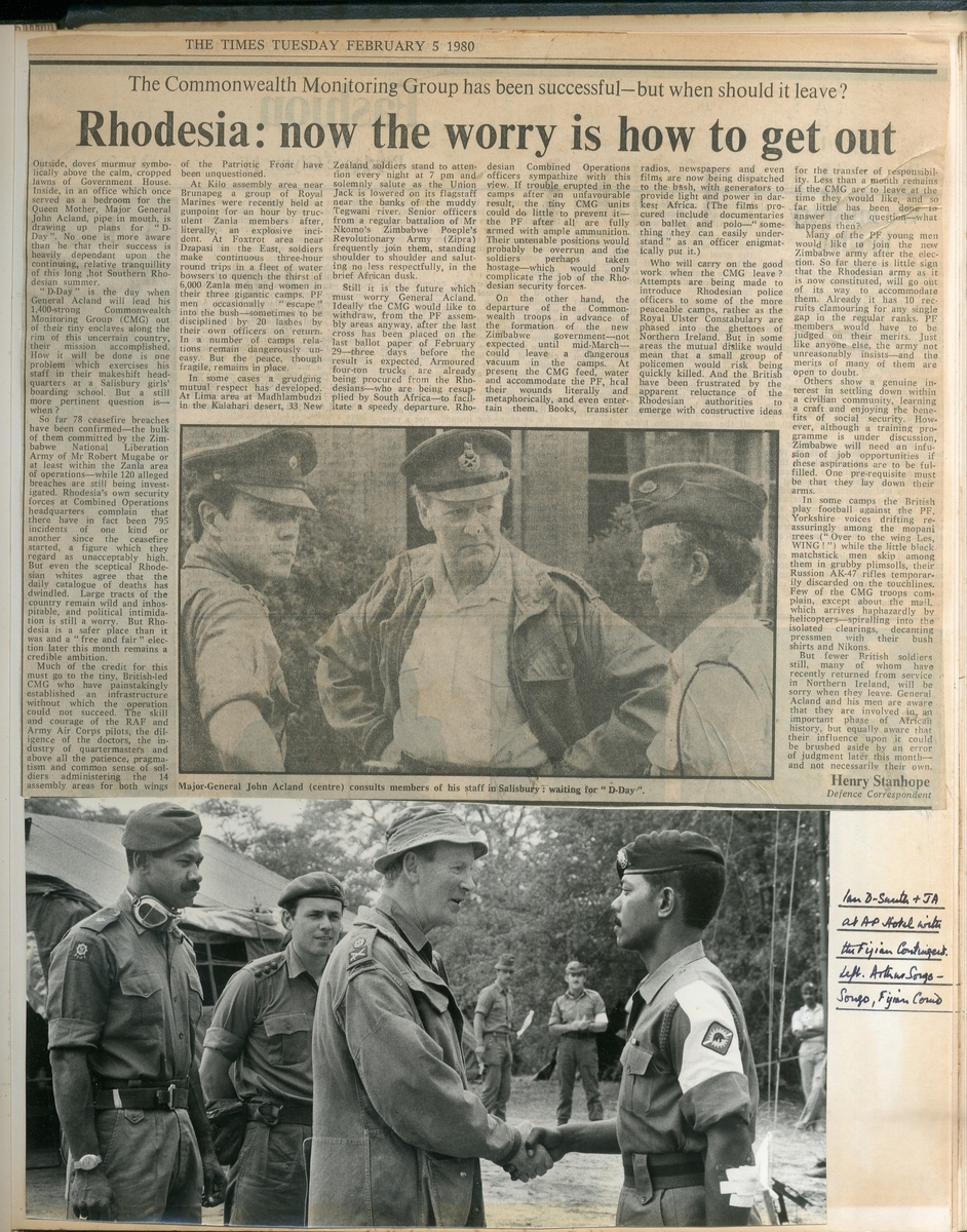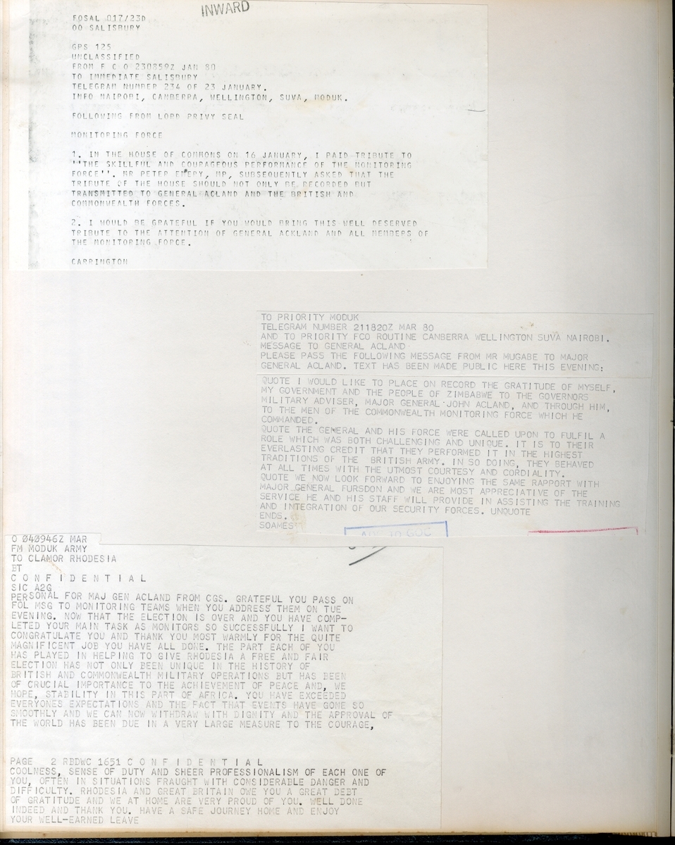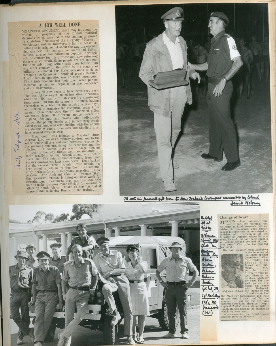 After prolonged negotiations, the black majority parties in Rhodesia reached agreement with the British Government and the white minority led by Ian Smith for Britain to resume responsibility for governing Rhodesia while elections were held. Warned that he might be ordered to Rhodesia on 'Guy Fawkes night' 1979 Acland was indeed selected to command the British Monitoring Force ordered to the country in the wake of the ceasefire, reporting to the newly appointed Governor, Christopher (later Lord) Soames. The huge challenge of overseeing a peaceful handover of power after a long and bitter civil war can hardly be overstated. It is perhaps best underlined by a short note written to Acland from Field Marshal Lord Carver when the news of his posting was made public, simply saying: