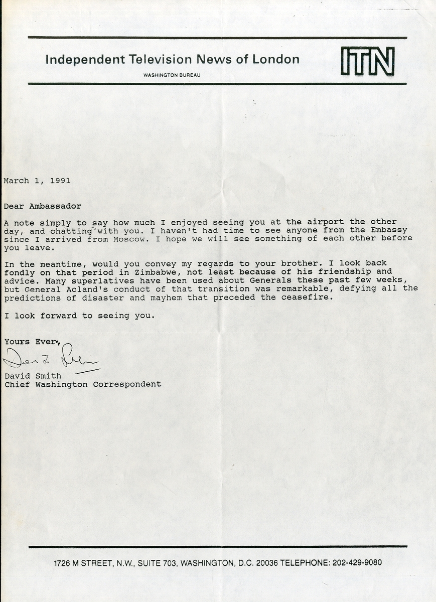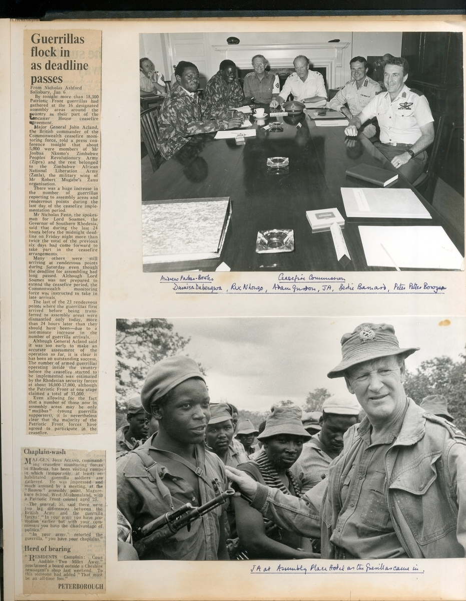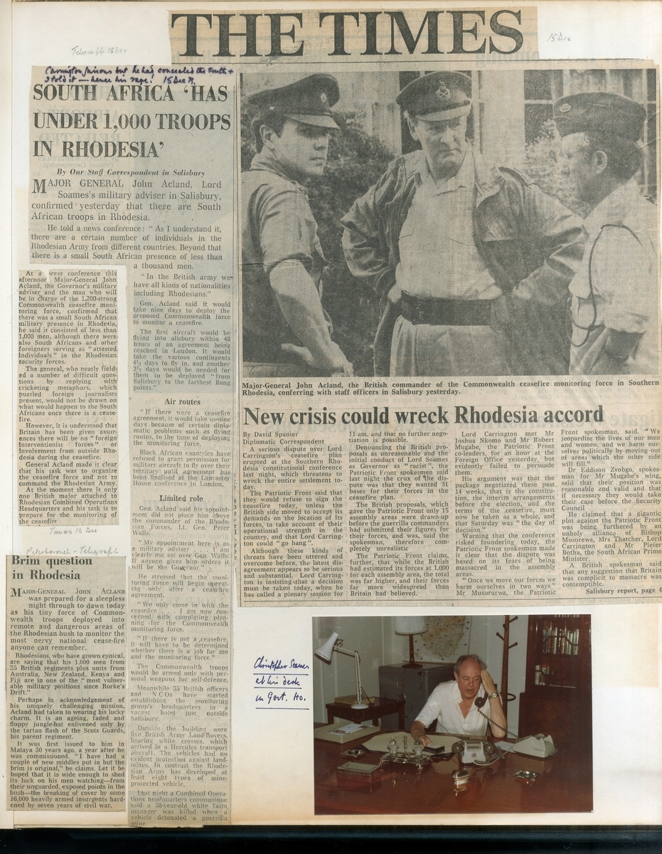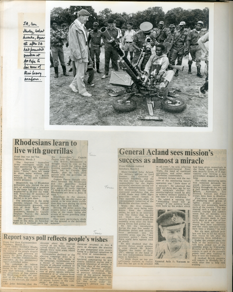 'Acland toured the outposts of the forest edge tirelessly, greeting the guerillas who had been persuaded to leave the forest and hand over their arms, and visiting them in their hastily erected camps to instil confidence in 'the democratic process'. In Salisbury (now Harare), Acland was able to provide up-to-the-minute advice to the Governor in his capacity as chairman of the Ceasefire Commission. Acland's relationship with Soames, not a man to welcome others' counsel, proved effective. His relationships with the white hierarchy in Salisbury, many of whom felt their personal situation threatened, varied from intensely warm to coldly formal, but these were extraordinary times.'