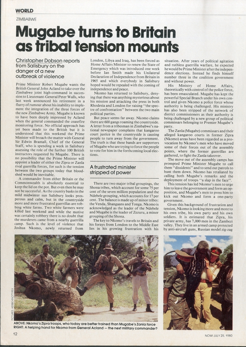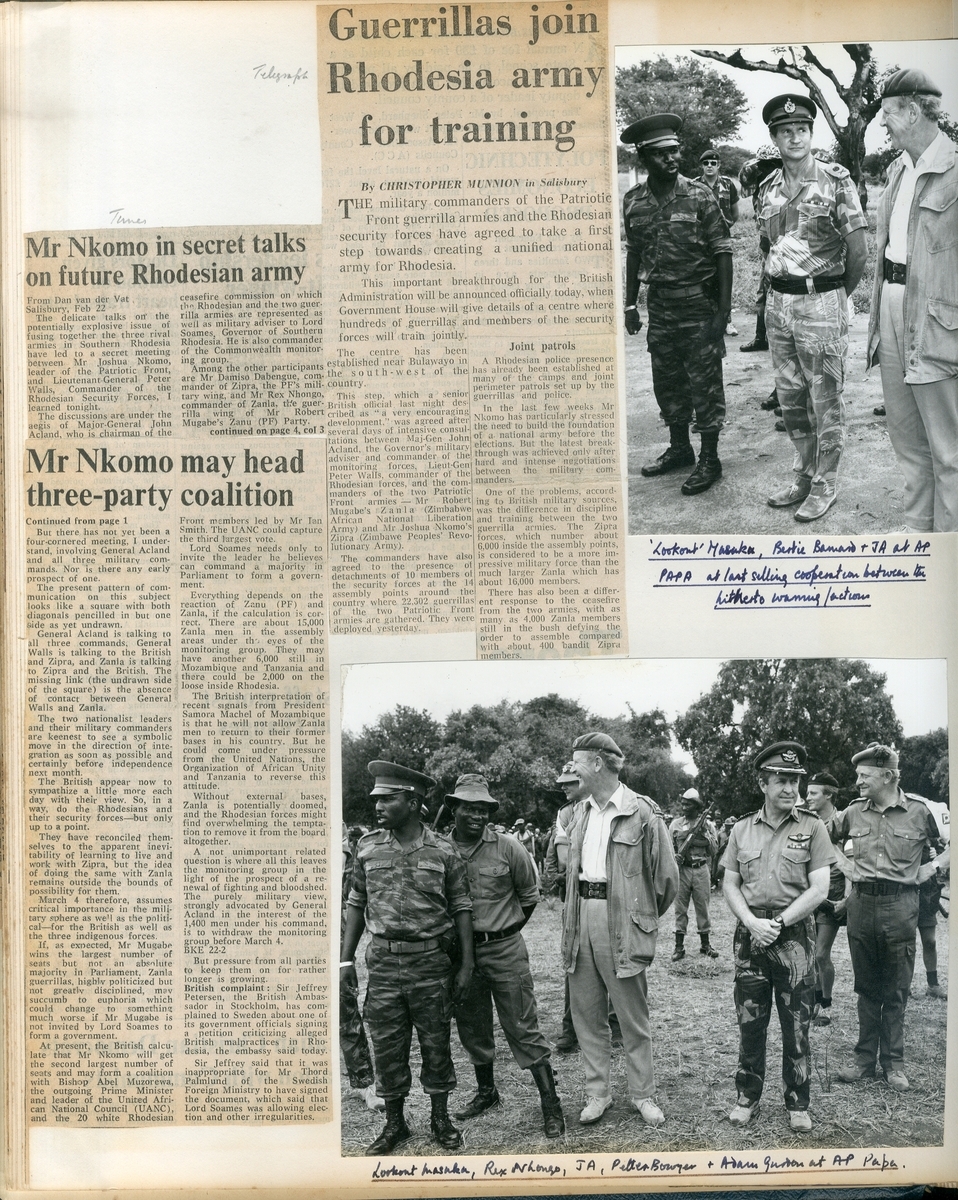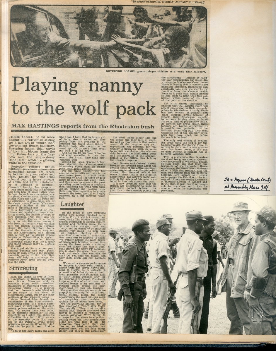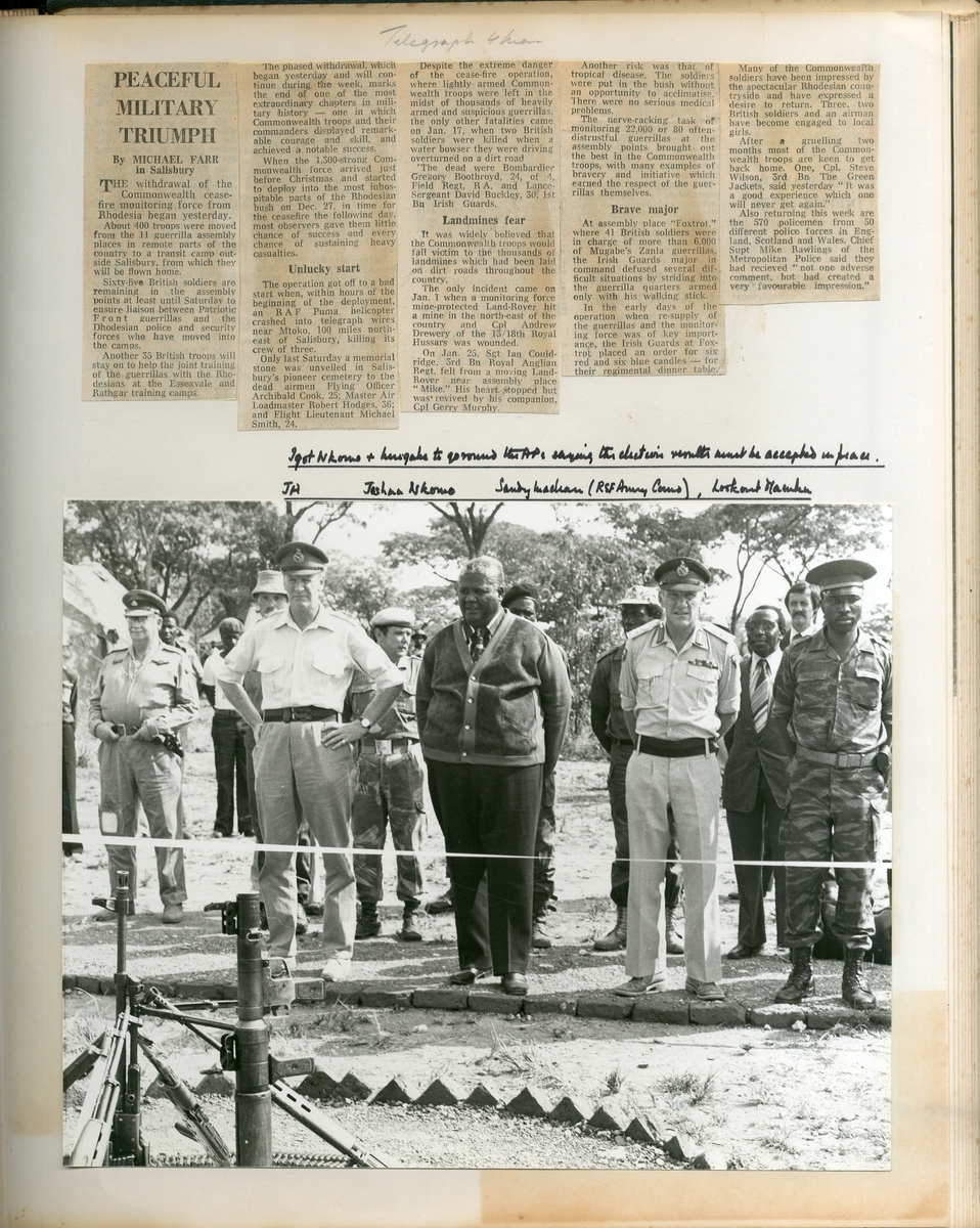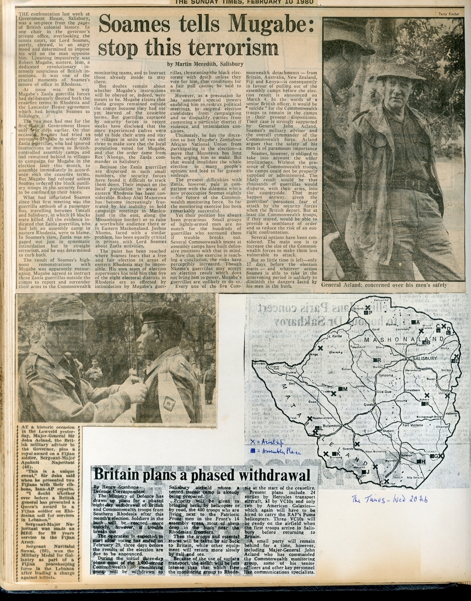 'Leaving aside the logistic difficulties, the most intractable problem that I personally had to overcome as the breaking down of the suspicion, hostility and indeed hatred which existed between the three sides as a result of seven years of the most vicious and bloody war. Curiously, Nkomo, Mugabe and their subordinates were much more inclined to reconciliation and reason than were the white Rhodesians in charge of the country, although the white farming and business communities recognised the realities of life very much more clearly than those who were in charge of their country's affairs. In the event, time and again, critical situations which appeared to be about to lead to a breakdown of the ceasefire and therefore of the whole process that the Government had set in train through the Lancaster House negotiations, were solved at the 11th hour as a result of the persuasion and pressures that I sought to put upon Walls, Mugabe, Nkomo or their subordinate commanders. In this process I was not much assisted during the first 6 or 8 weeks by the Governor or senior Foreign Office officials present; and it was not really until we had been in the country for some 2 months, with the Ceasefire apparently holding and the election process well under way, that they came into their own.'