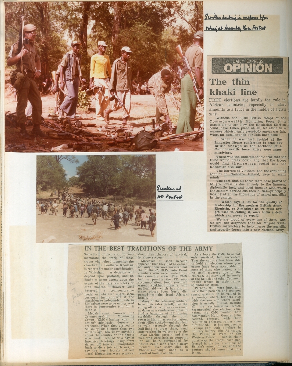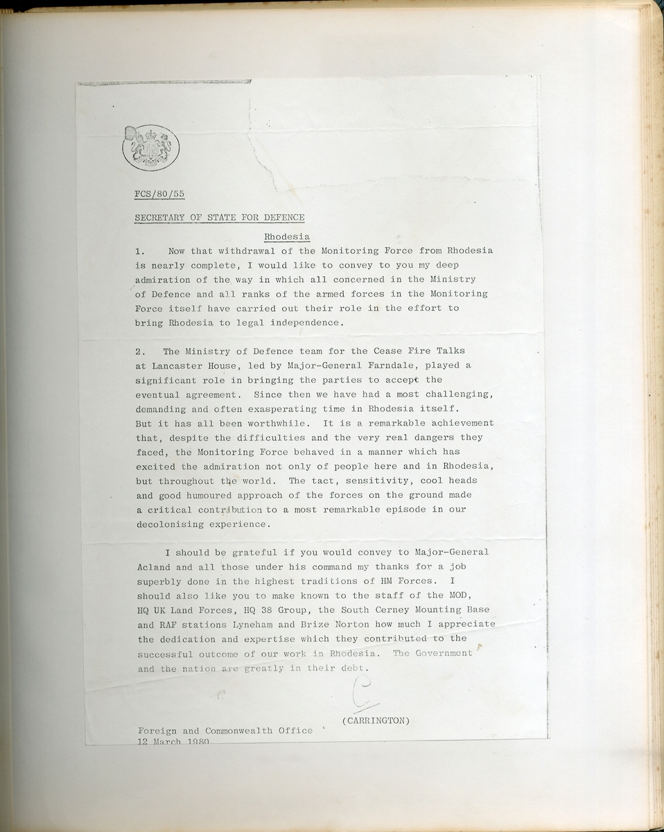 A document typed by the recipient titled: 'The Commonwealth Monitoring Force Zimbabwe/Rhodesia 1979-1980' summarising the campaign and its lessons.