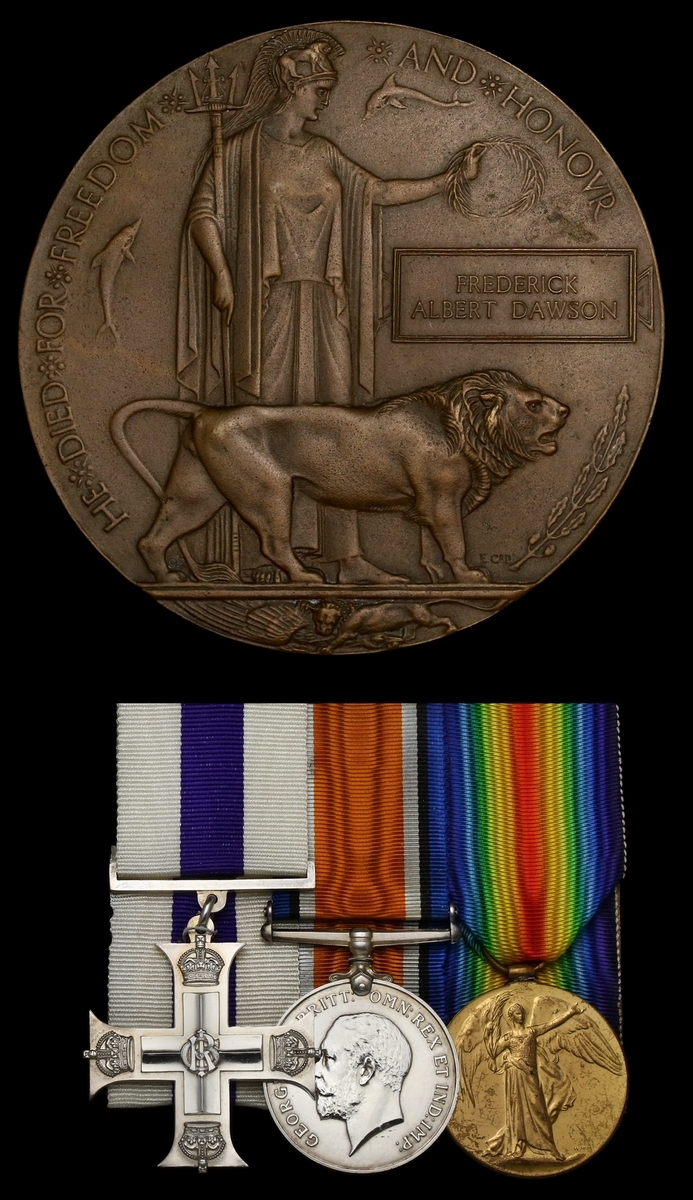 A Great War M.C. group of three awarded to Captain F. A. Dawson, East Surrey Regiment who was killed in action on 7 August 1918 during the Battle of Amiens