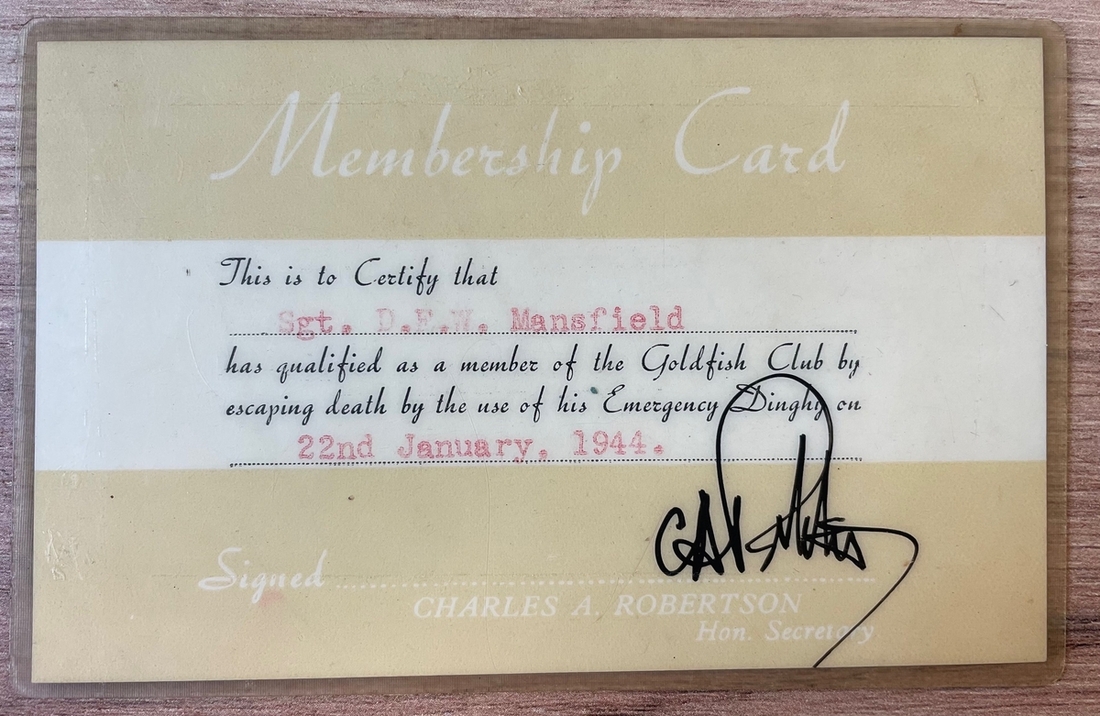 In one sortie - whilst returning from Magdeburg in a flak damaged Halifax on 21 January 1944 - his pilot had to ditch in the North Sea: just Mansfield and two of his crew survived the ordeal, eventually being plucked from their dinghy unconscious and covered in ice; they took Membership of the Goldfish Club for their troubles