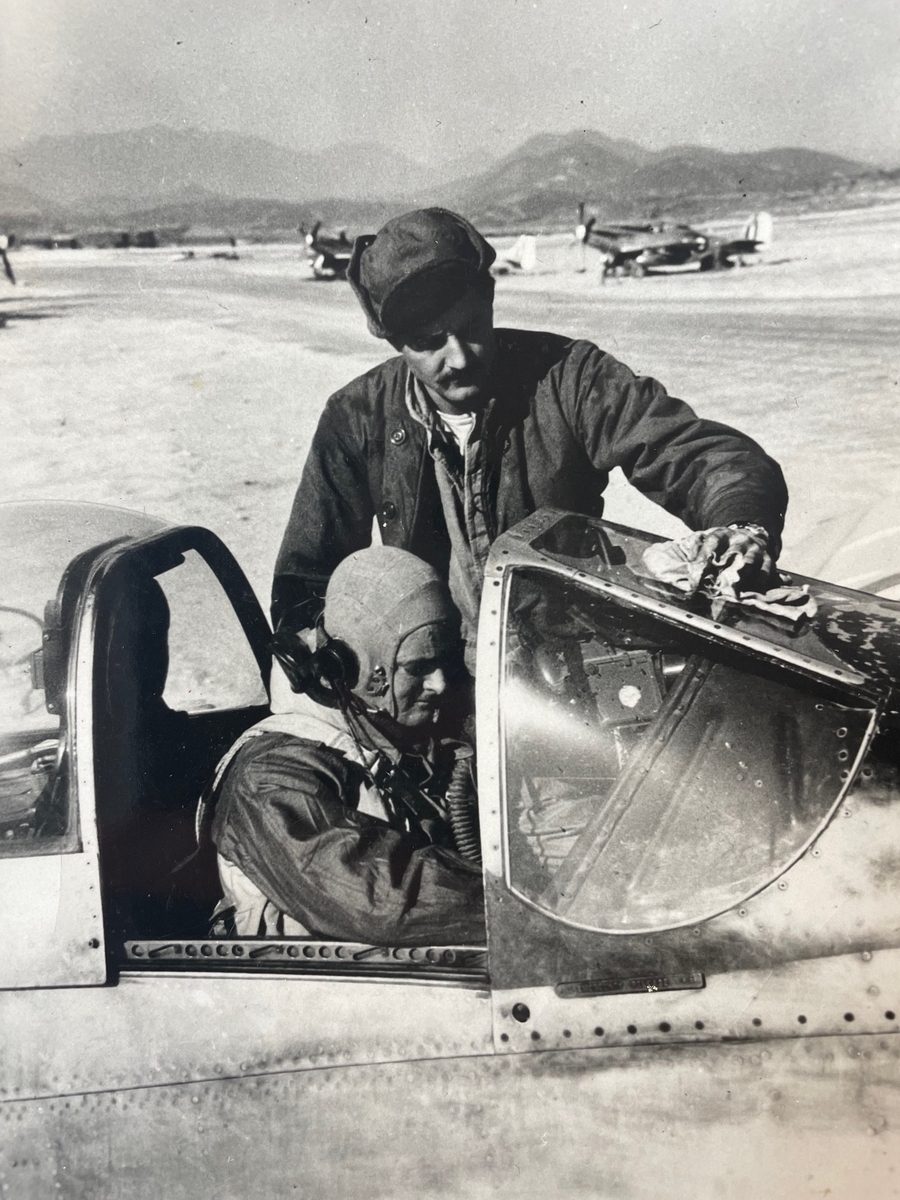 On one occasion he had to crash land his Mustang off the runway at Pusan; on another, in thick fog, he was forced to ditch his Meteor in the sea