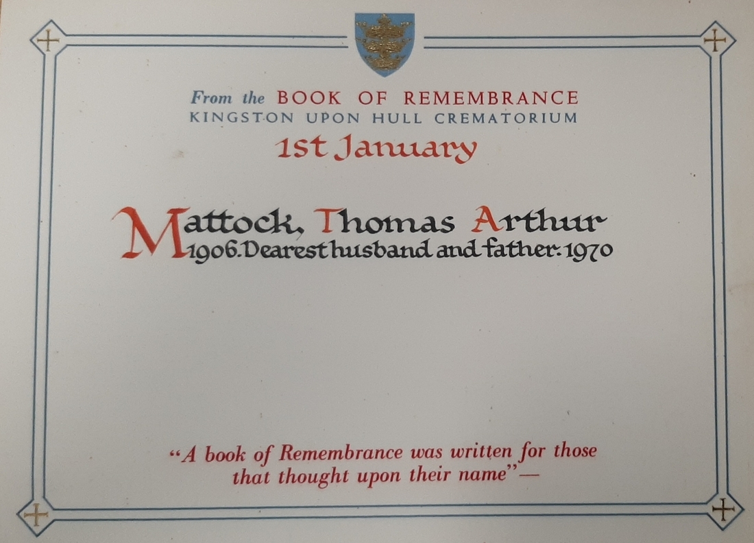 Thomas Arthur Mattock was born at Daventry, Northamptonshire in January 1906 and enlisted as a boy recruit in the York & Lancaster Regiment (Territorials) in July 1921, the same month in which he was posted to the 5th Battalion. Having then served as a Drummer and been advanced to Lance-Corporal, he was discharged on the termination of his period of engagement in July 1936; according to a family source, 'he was very musical, having played in a dance band and played piano for the silent movies.'