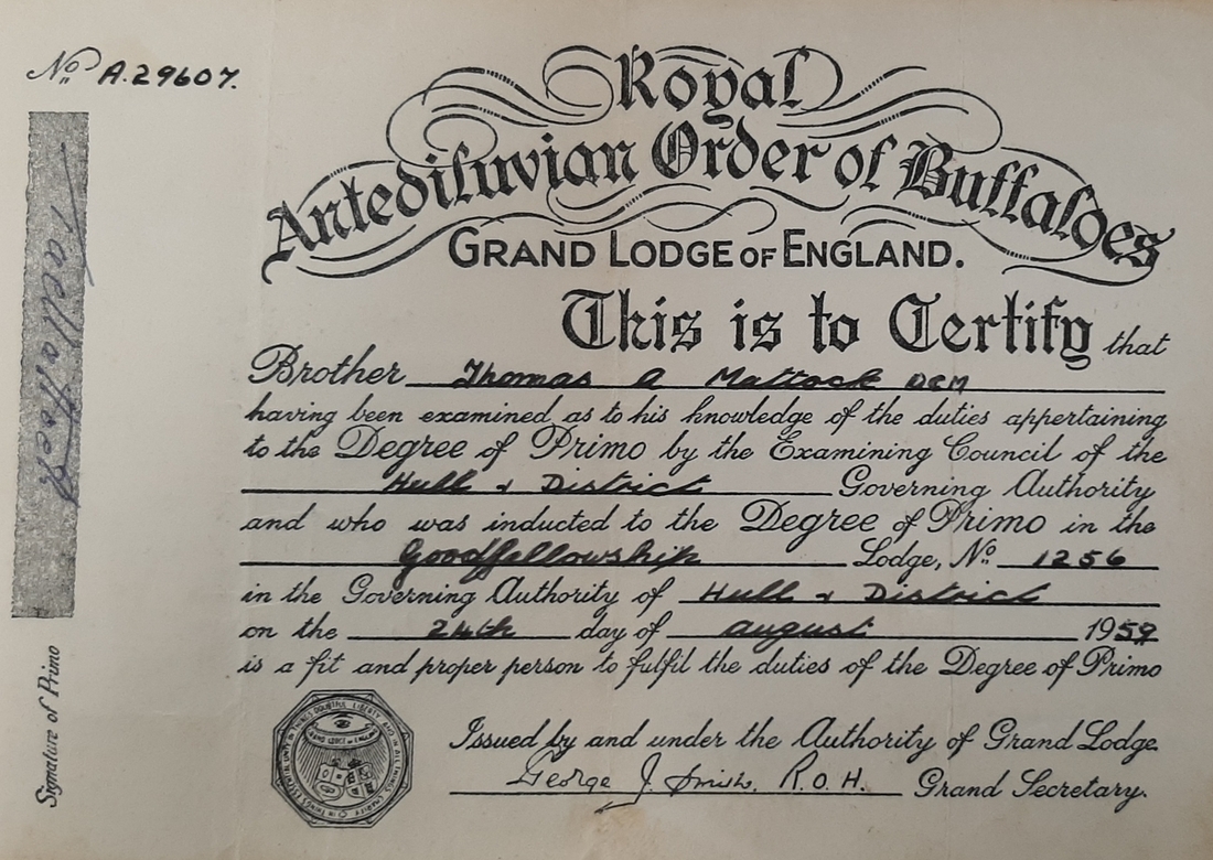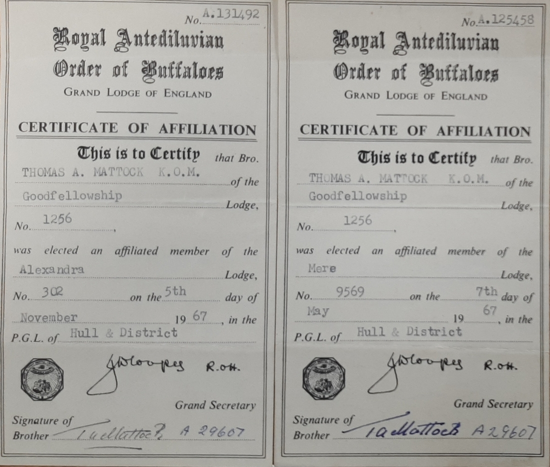 Assorted certificates relating to his membership of the Royal Order of the Buffaloes (R.A.O.B.).