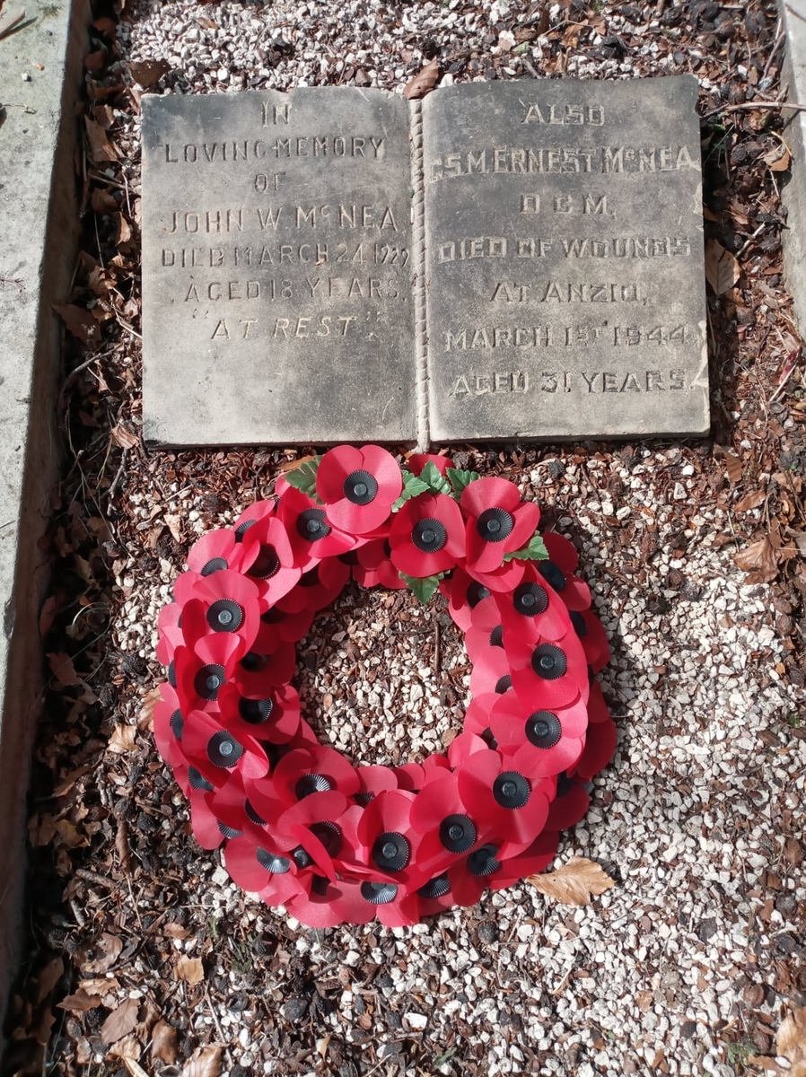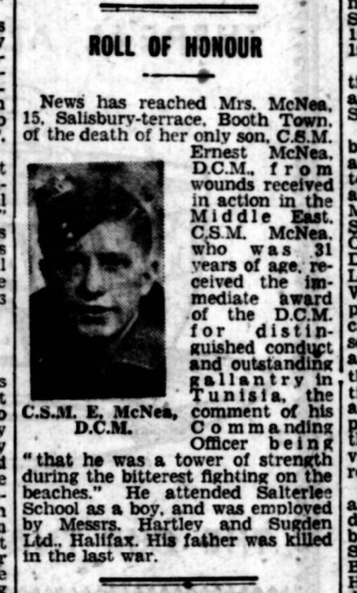 Ernest McNea was a native of Halifax, Yorkshire and died of wounds on 1 March 1944. He is buried at Beach Head War Cemetery, Anzio, Italy, whilst a memorial to him exists at Christ Church Pellon, Hallifax. His mother went to Buckingham Palace, together with his sister, to take this D.C.M. from the hands of The King.