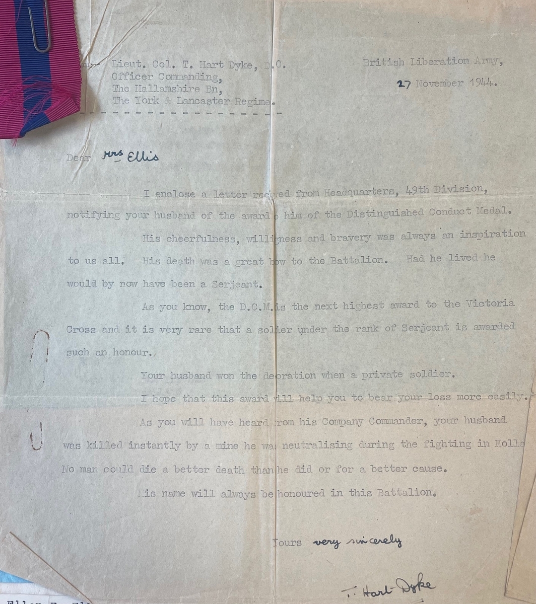 It was not to be for he was killed in action in the outskirts of Oude Molen on 5 November 1944. He had been clearing enemy mines in the streets to allow his comrades to carry home the attack. His widow Ellen would go up to Buckingham Palace to take his D.C.M. from the hands of The King on 30 July 1946. Ellis was buried in the Roosendaal-en-Nispen Cemetery, Holland.