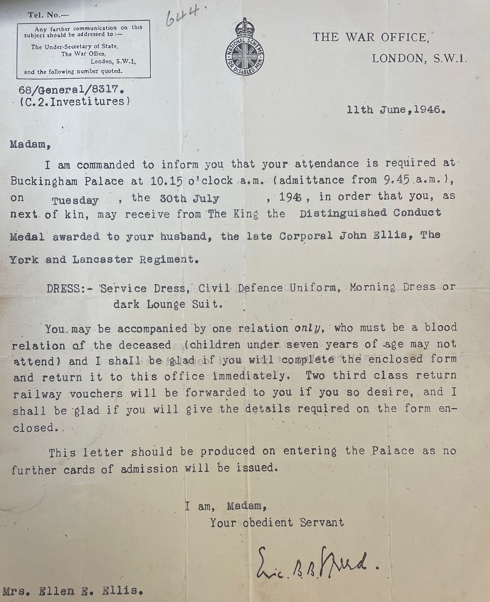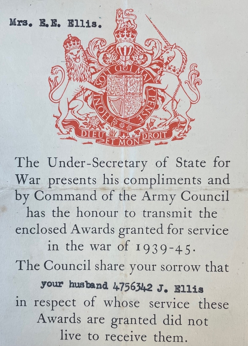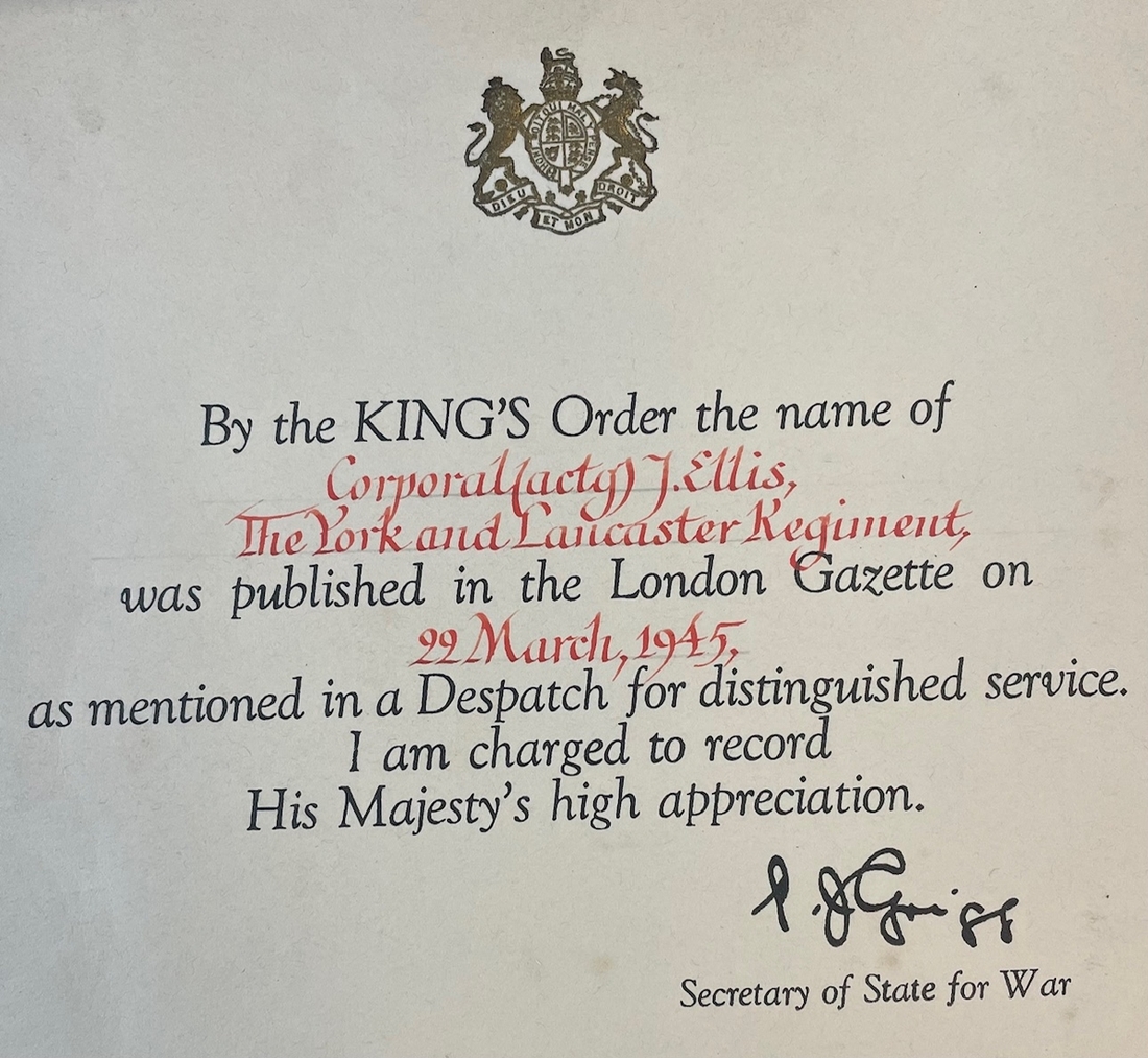 John Ellis was a native of Newport Street, Leeds, West Yorkshire and served overseas with the Pioneer Platoon of the 4th (Hallamshire) Battalion, York and Lancaster Regiment. Details of the probable award for his M.I.D. were reported in the Leeds Evening Post of 23 November 1944: