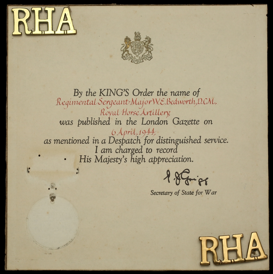 Advanced Warrant Officer Class II in 1941, Bedworth saw further service with the 8th Army through North Africa into Italy, and for his service was Mentioned in Despatches (London Gazette 6 April 1944. He saw further action post D-Day in North West Europe, and according to family tradition was wounded in 1945. He died in Birmingham on 27 January 1981.