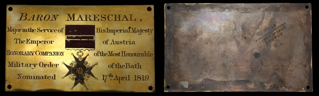 (x) The Most Honourable Order of the Bath, C.B. (Military) Companion's Chapel Stall Plate, gilded brass with engraved and painted image of a C.B. Badge, inscribed 'Baron Mareschal, Major in the Service of His Imperial Majesty The Emperor of Austria Honorary Companion of the Most Honourable Military Order of the Bath Nominated 17th April 1817', 191mm x 115mm, corners pierced for attachment, minor loss of paint, otherwise very fine