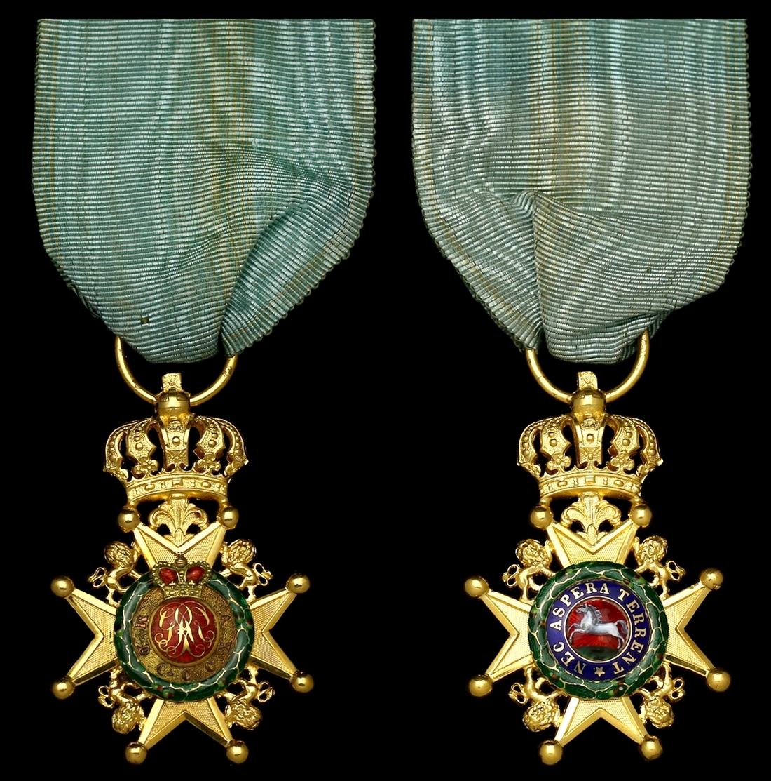 The Royal Guelphic Order, K.H. (Civil) Knight’s breast Badge, 50mm including crown suspension x 33mm, gold and enamel, good very fine and a most handsome Badge