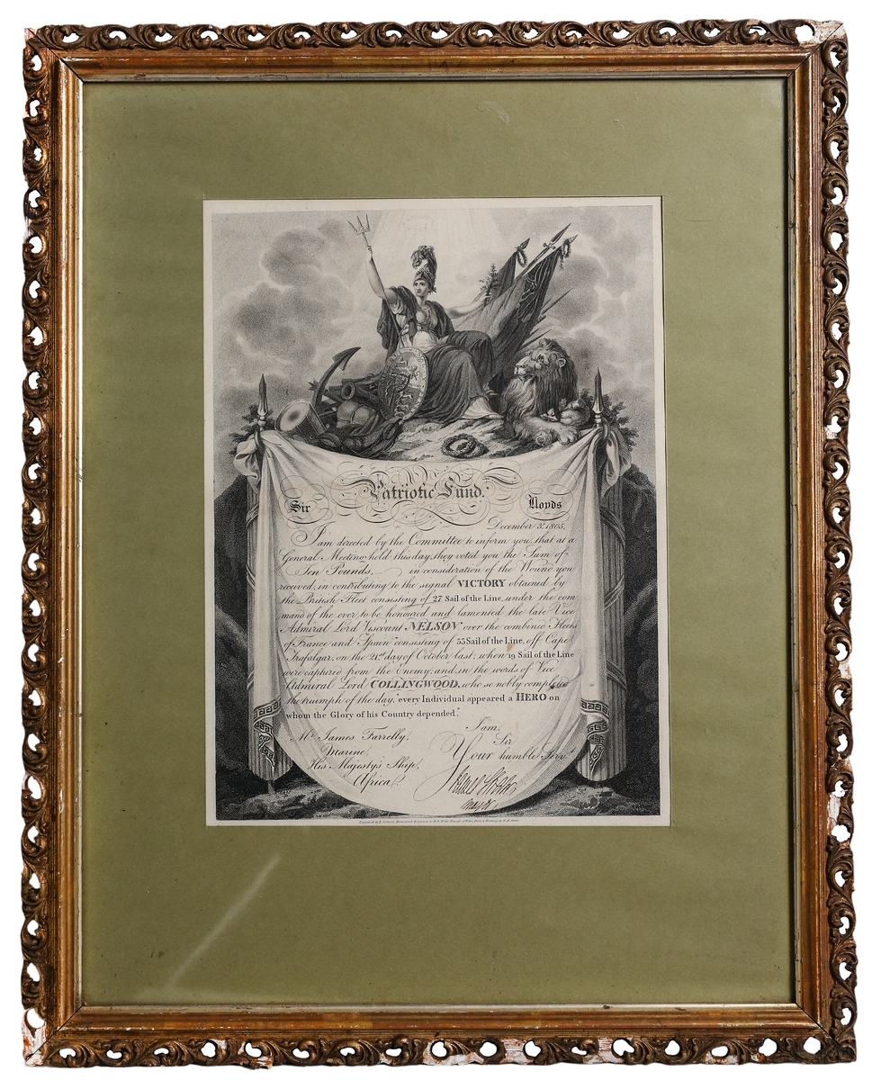 Lloyd’s Patriotic Fund Honorary Wounds Certificate for Ten Pounds in the name of 'Mr James Farrelly Marine H.M.S. Africa', dated 3 December 1805, glazed and framed, good very fine