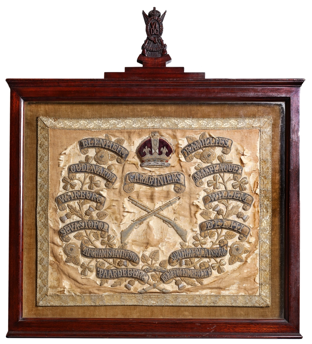 6th Dragoon Guards (Carabiniers), Kettle drum banner or Trumpeters banner, early 20th century, the banner 310mm x 300mm approx., silk and bullion cloth, with Battle Honours of 'Blenheim, Ramillies, Oudenarde, Malplaquet, Warburg, Willems, Sevastopol, Delhi 1857, Afghanistan 1879-80, Relief of Kimberley, Paardeberg, South Africa 1899-02', in a most attractive glazed mahogany frame, fittings for easy opening to reverse, this surmounted with a carved regimental badge, some wear commensurate to age to banner, frame in excellent condition, very fine