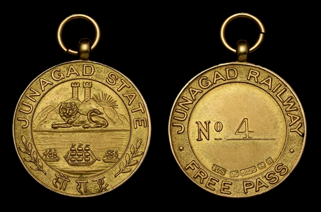 Junagad State Railway Free Pass, 23mm, gold, hallmarks for 15 carat (.625) and maker's initials 'RS', officially numbered '4' to reverse, good very fine
