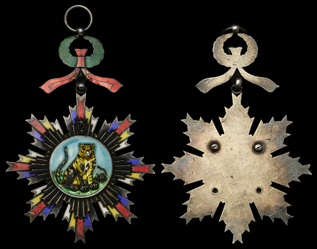 (x) China, Republic, Order of the Striped Tiger, 2nd Class sash Badge (2 stars on top), 108mm including wreath suspension x 74mm, silver-gilt and enamel, some enamel chipping, two nuts missing from reverse, very fine