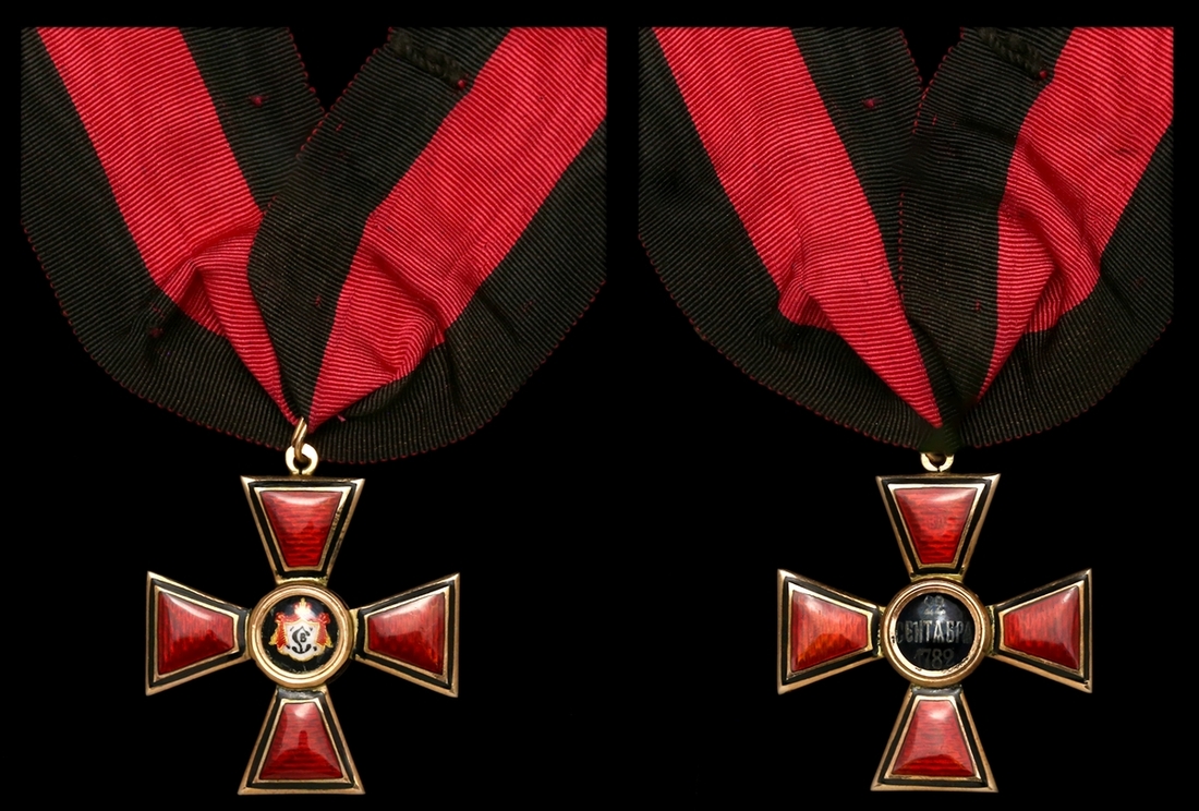 Russia, Imperial, Order of St Vladimir, Civil Division breast Badge, 35mm, gold and enamel, purity marks to loop, maker's details under enamel to reverse, gold marks to sword hilts, good very fine, with fitted case, with old paper label with inscription pasted to lid