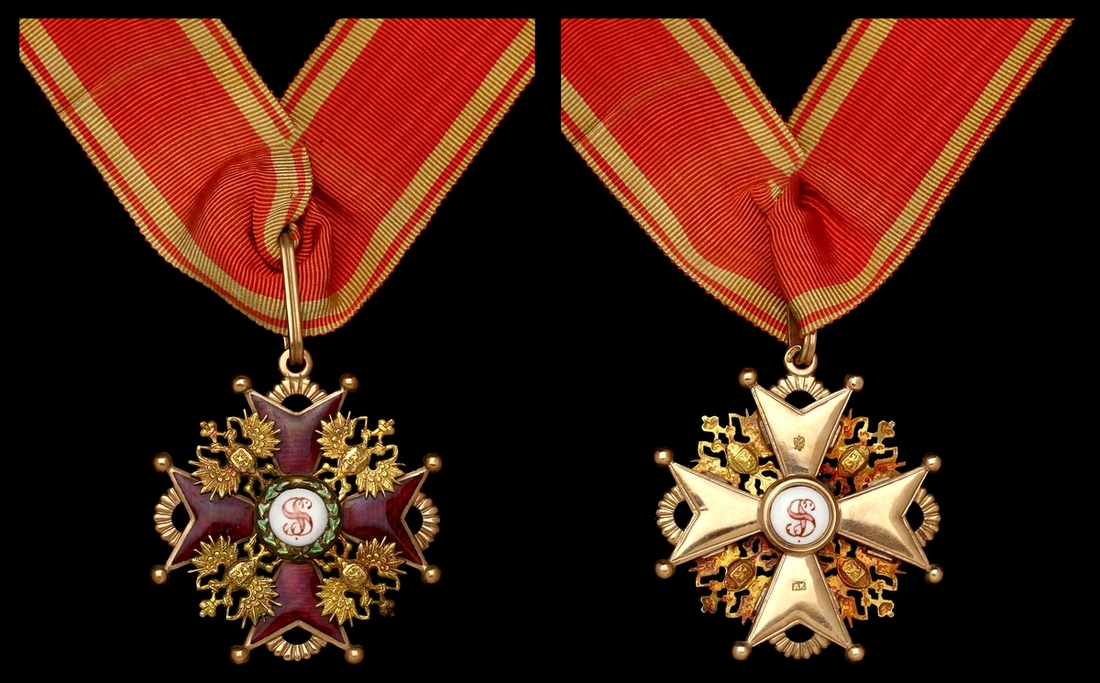 Russia, Imperial, Order of St Stanislaus, Civil Division neck Badge, by Kiebel, St Petersburg, 46mm, gold (56 zolotniki) and enamel, maker's initials and court stamp to reverse, purity marks to loop, good very fine, with length of neck riband