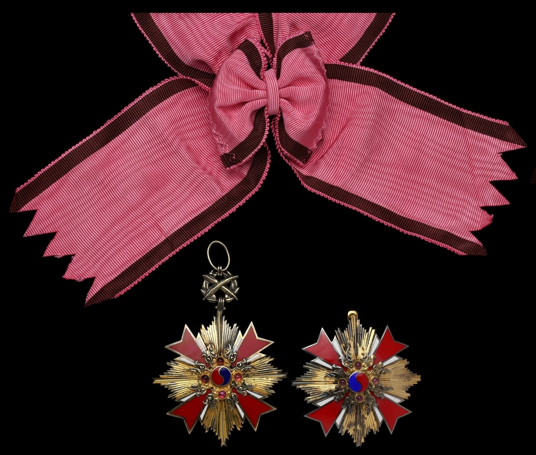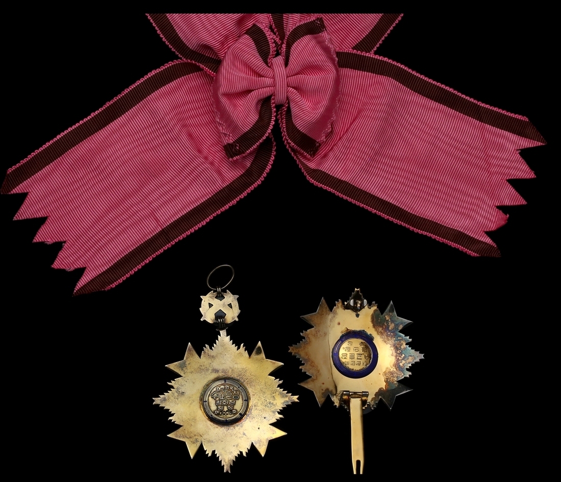 (x) South Korea, Republic, Order of Diplomatic Service Merit, 1st Grade Gwanghwa Medal set of Insignia, comprising sash Badge, 74mm, silver-gilt, enamel and enhanced with four cabochons, reverse officially numbered '1006'; breast Star, 70mm, silver-gilt, enamel and enhanced with four cabochons, good very fine, with full sash riband (2)