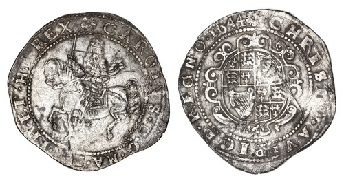 Charles I (1625-1649), Civil War Issues, Royalist Devon, Exeter Halfcrown, 1644, (m.m.) CAROLVS • D • G • MA • BR • FRA • ET • HI • REX, King on horseback riding left, sash in two ends, horse with twisted tail, rev. (m.m.) • CHRISTO • AVSPICE • REGNO • 1644, oval garnished shield, g, 2h, m.m. rose (Brooker 1051-52; North 2568; S.3075), scuffed in parts and scratched through the shield, nonetheless with pleasing definition to armour and horse's tail, good very fine for type