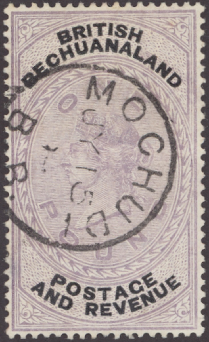 £1 lilac and black, cancelled by a neat and central strike of Mochudi B.B. c.d.s.; there is a light horizontal crease and a thin affecting a few perfs. near the lower left corner. PFSA Certificate (1981) and B.P.A. Certificate (2014). S.G. 20, £900. Photo