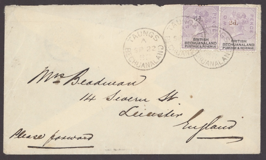 1888 (22 Sept.) flimsy envelope to Leicester bearing 2d. on 2d. and 6d. on 6d. tied by neat Taungs c.d.s. with a further strike alongside, the reverse bearing Cape Town (26.9) and Leicester arrival (16.10) c.d.s.; there is a tear at right, clear of the adhesives. A neat and attractive cover paying 8d. rate. Photo